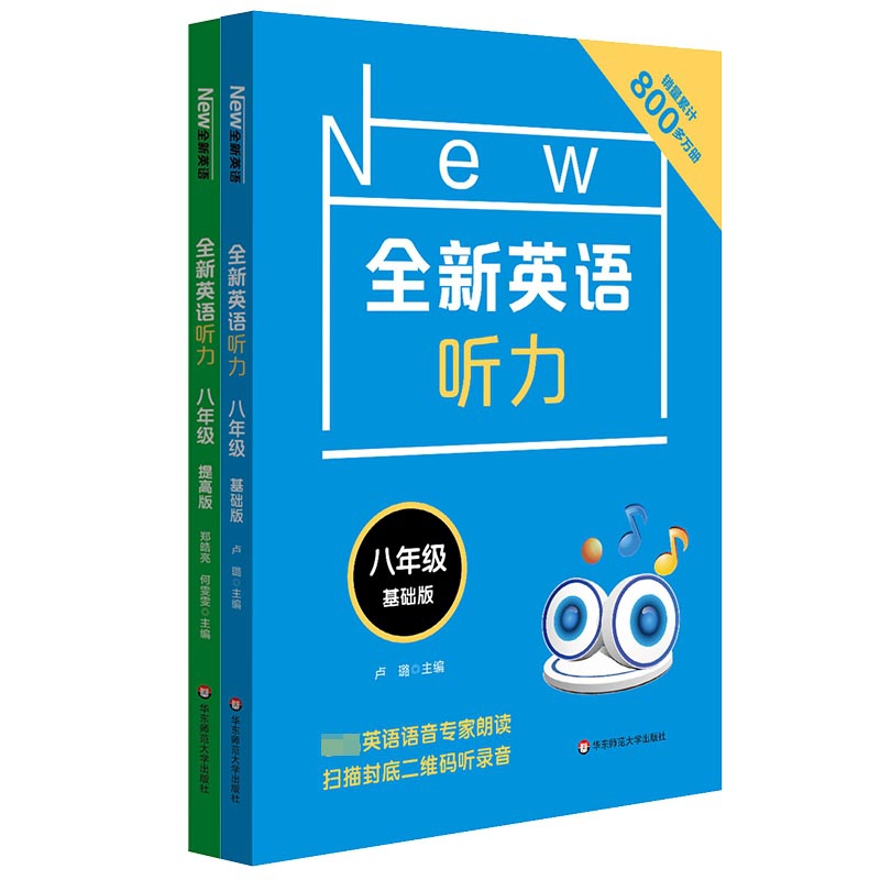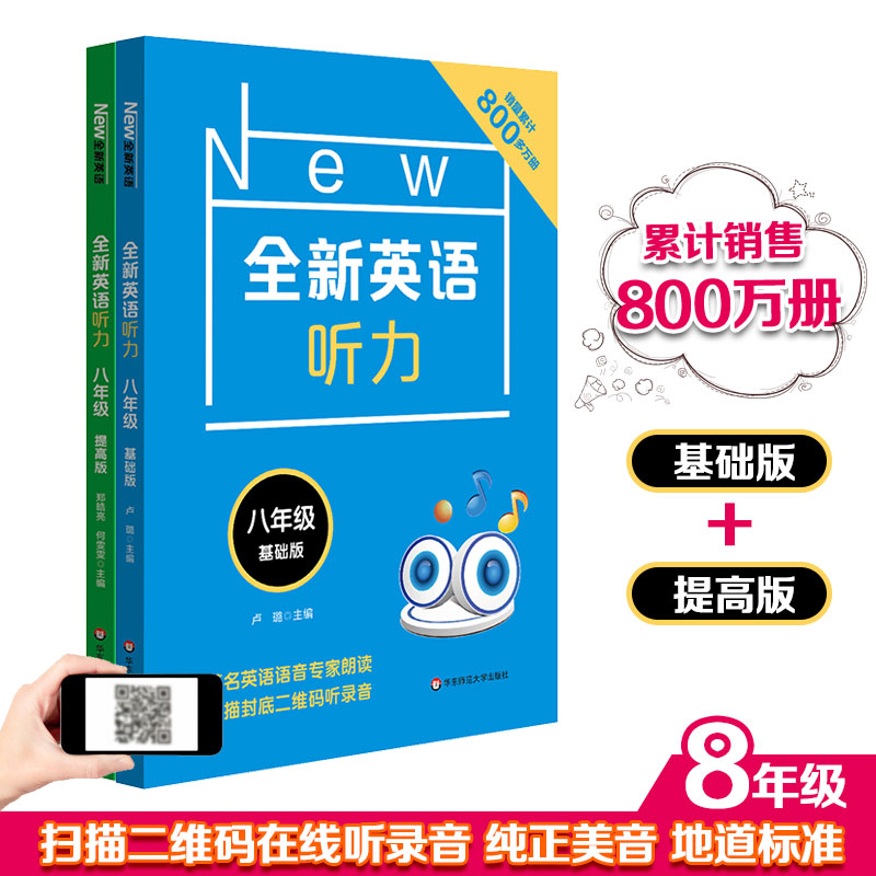 全2册 中学8年级英语听力练习专项训练 附听力参考原文 全新英语听力八年级初二 华师大出版 提高版 参考答案 社中学教辅 基础版
