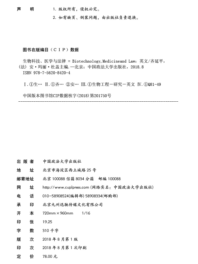 医学与法律 Medicineand 正版 生物科技 安·玛丽·杜盖主编 社 法 书籍 英文 Law Biotechnology 中国政法大学出版 齐延平