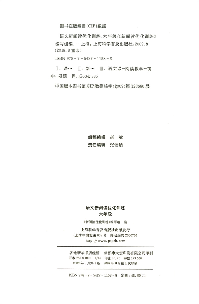 六年级 语文新阅读优化训练 6年级 语文素质教育阅读训练 社 正版 上海科学普及出版 现货