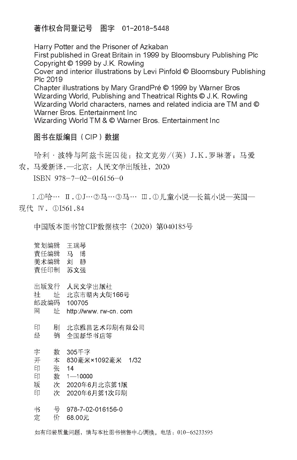 人民文学出版 哈利·波特与阿兹卡班囚徒拉文克劳平装 完整复制英国版 哈迷收藏版 社 哈利·波特20周年学院纪念版