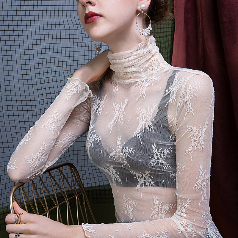 新款 秋季 内搭2025秋季 女网纱洋气高领修身 上衣 堆堆领蕾丝打底衫