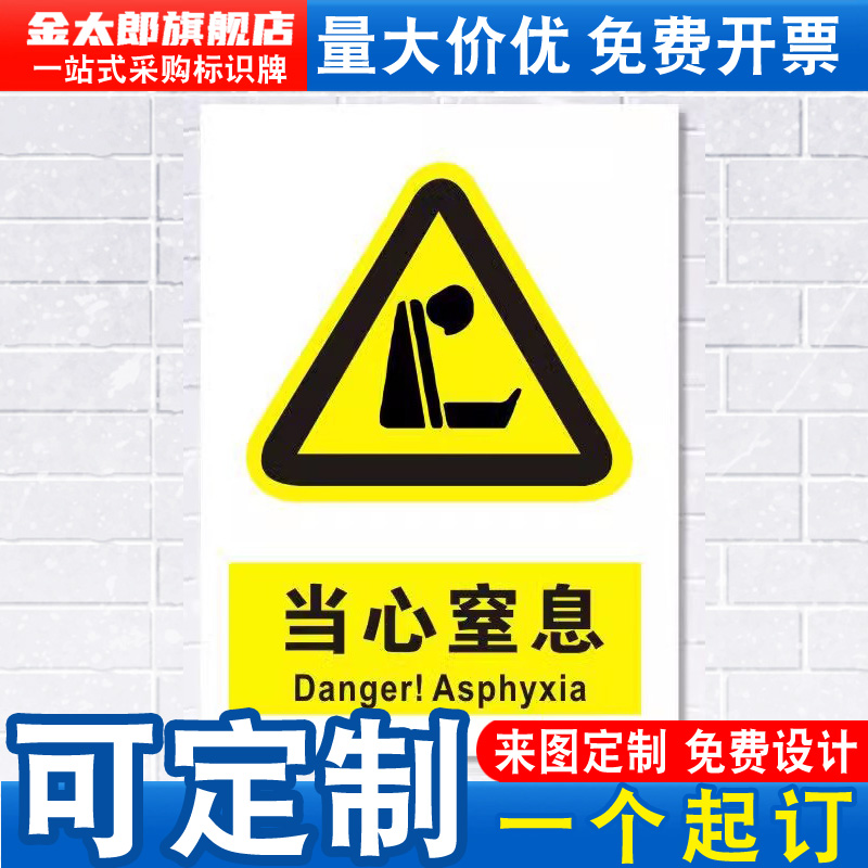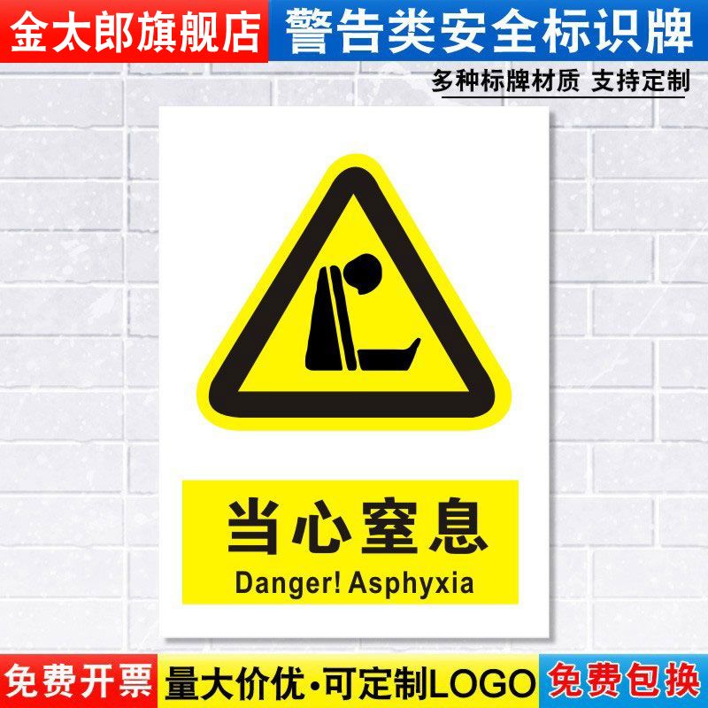 当心窒息标识牌注意小心受限有限空间消防安全警示工厂车间仓库警告标示标志牌标语贴纸提示贴墙贴指示牌定做