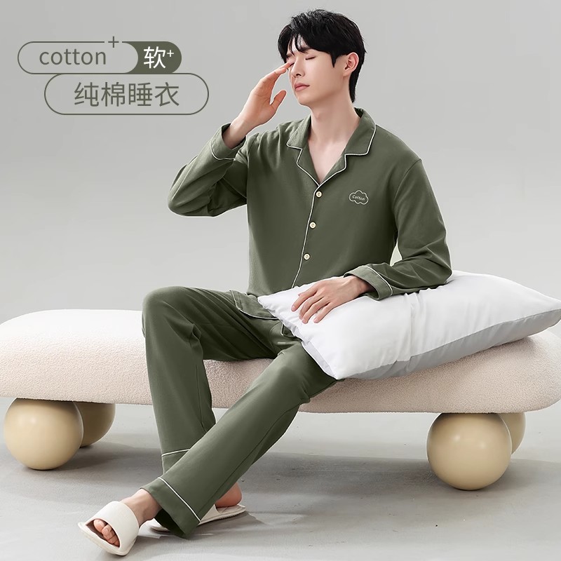 大码 长袖 长裤 猫人纯棉睡衣男士 家居服套装 2025新款 纯色男士 春秋款