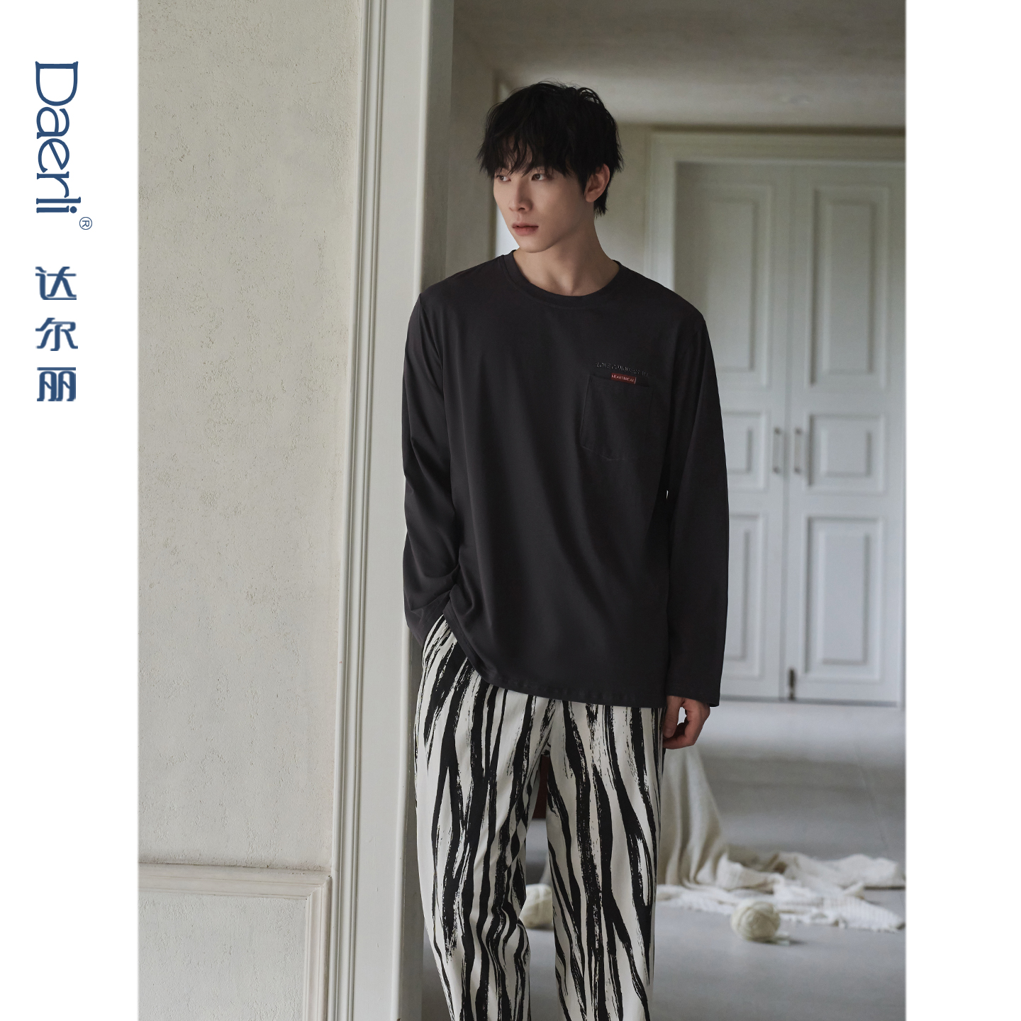 达尔丽柔软奥力棉情侣睡衣纯棉长袖 圆领条纹印花家居服 2025秋薄款