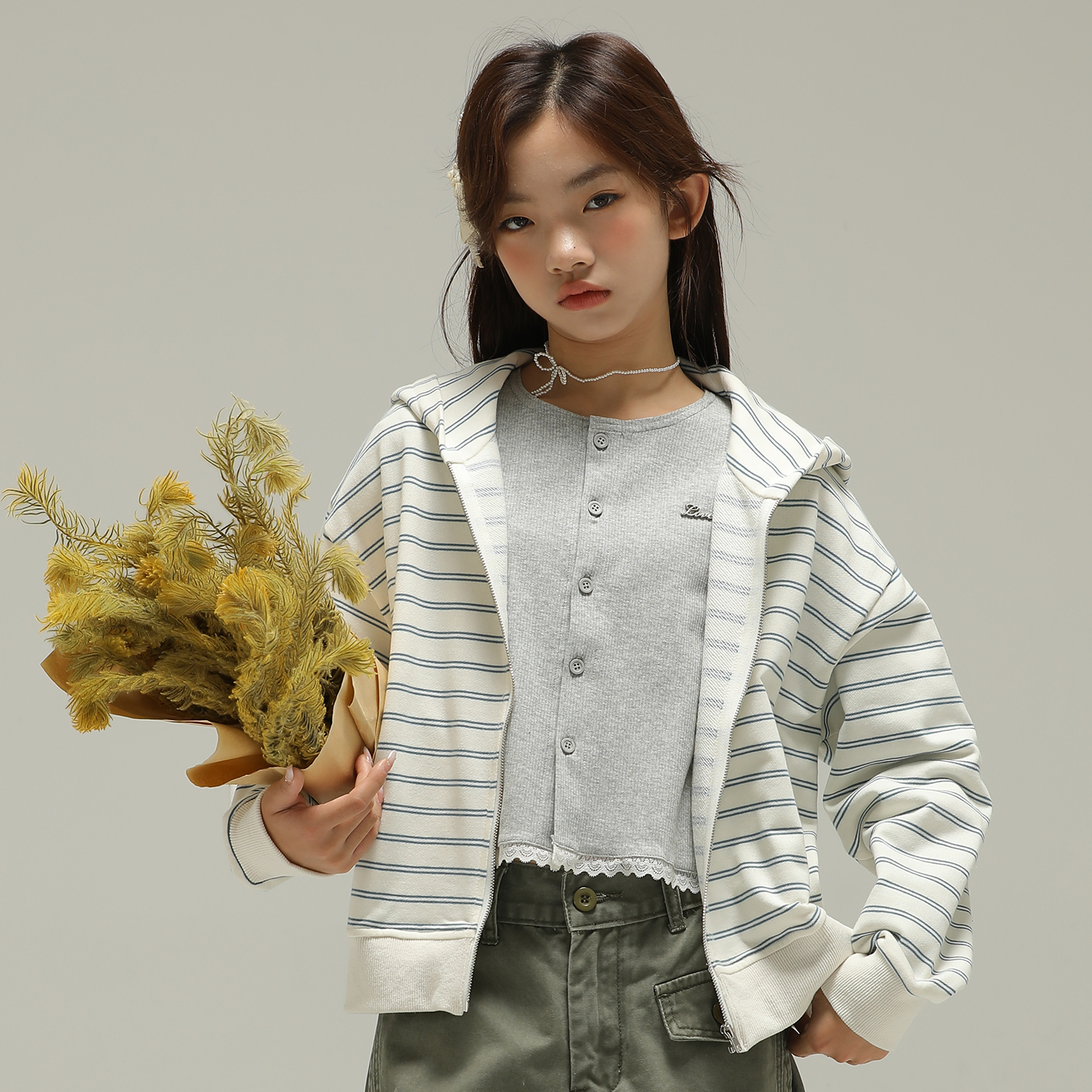 小女森女童春秋长袖 儿童韩系圆领针织上衣女 T恤灰色蕾丝花边开衫