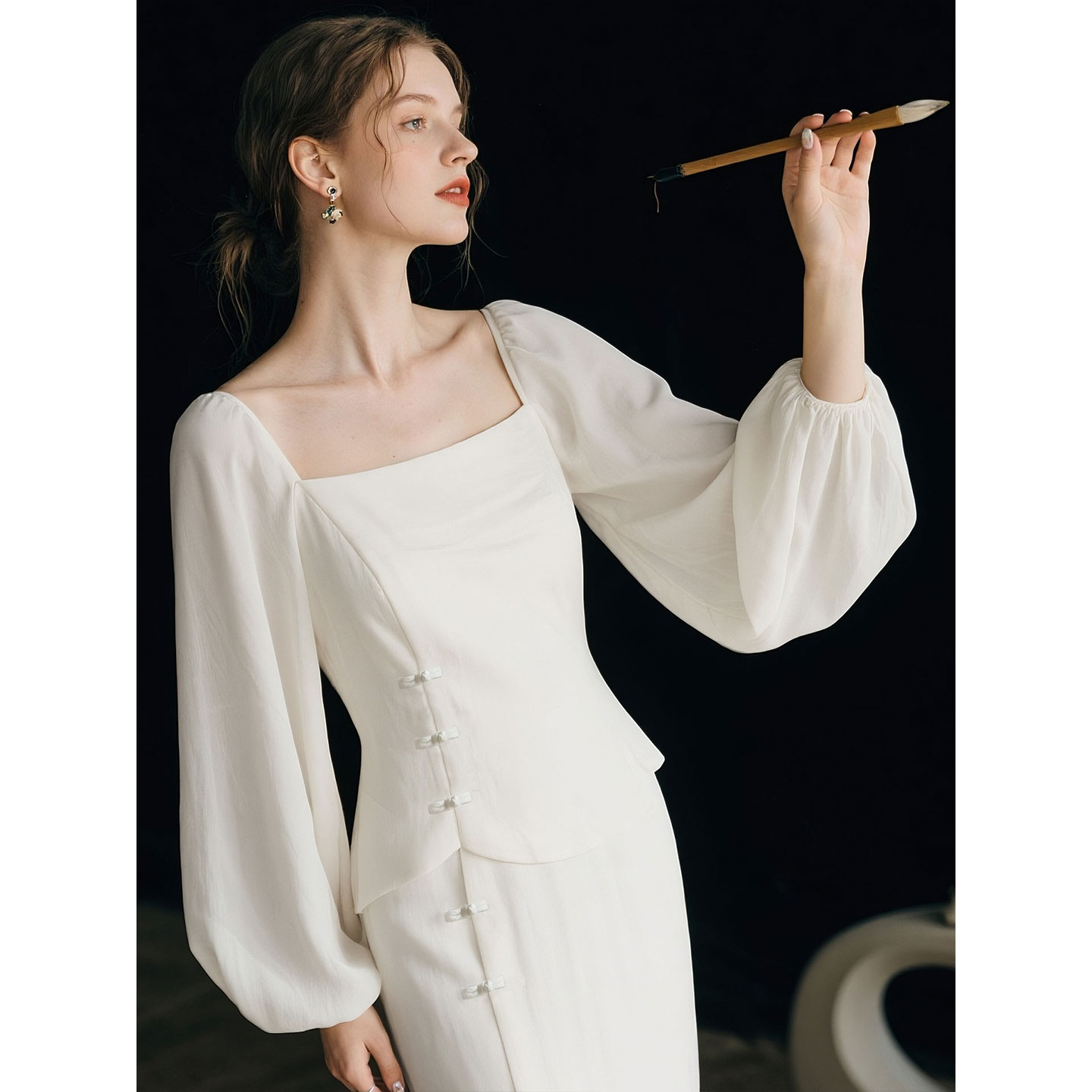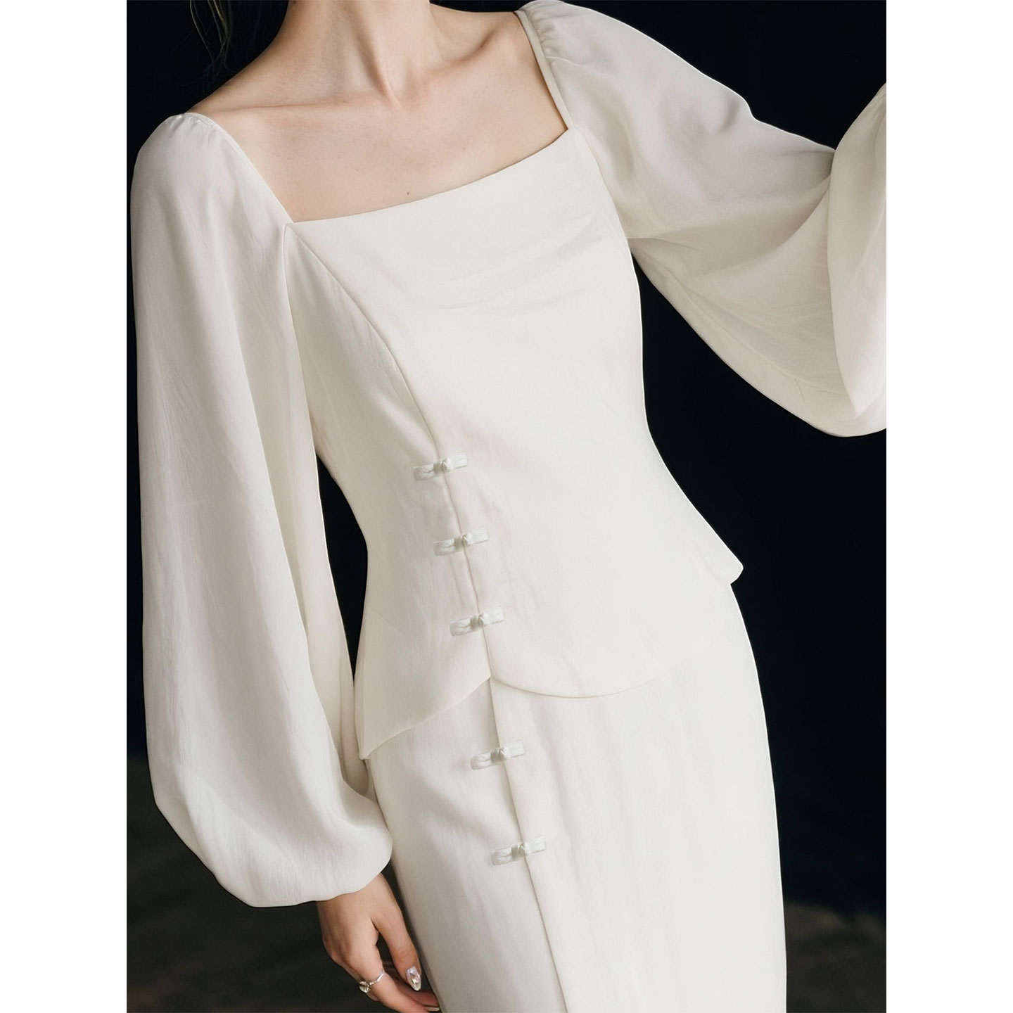 方领盘扣衬衫 新中式 新款 女2025年秋季 半身裙两件套 国风天丝套装