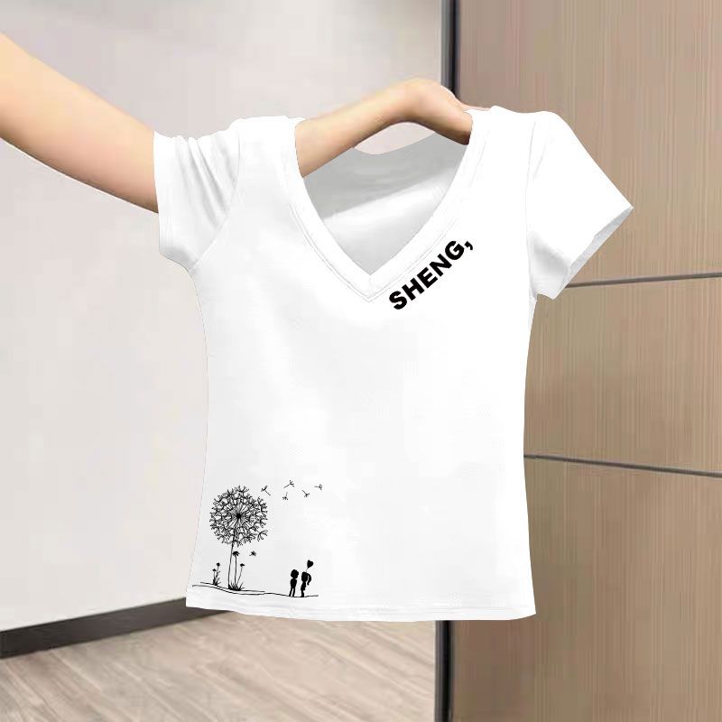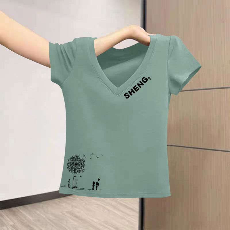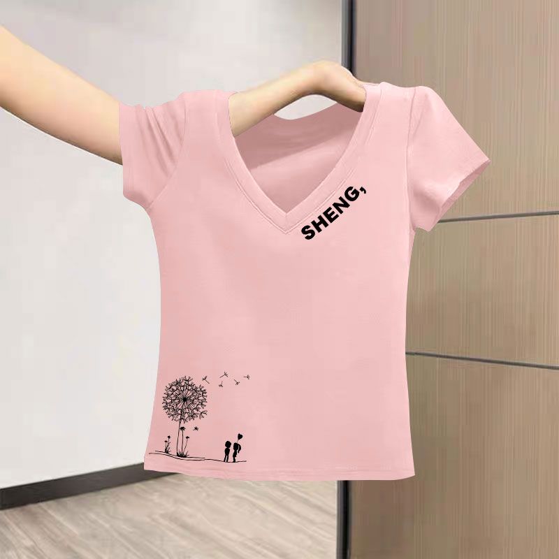 洋气韩版 夏季 新款 休闲V领T恤女时尚 百搭印花宽松显瘦上衣 纯棉短袖