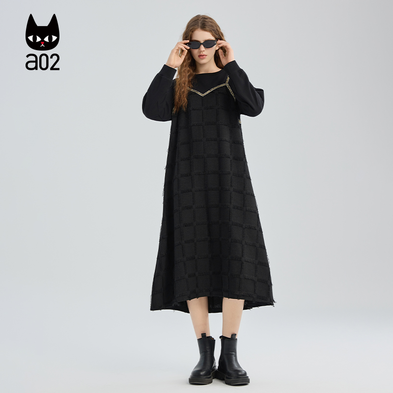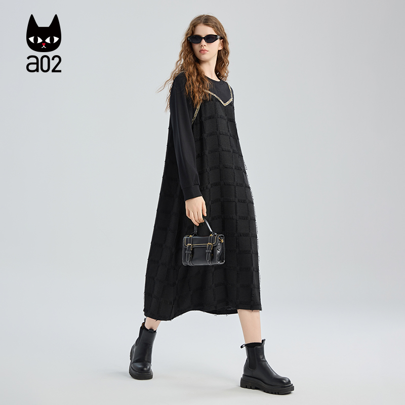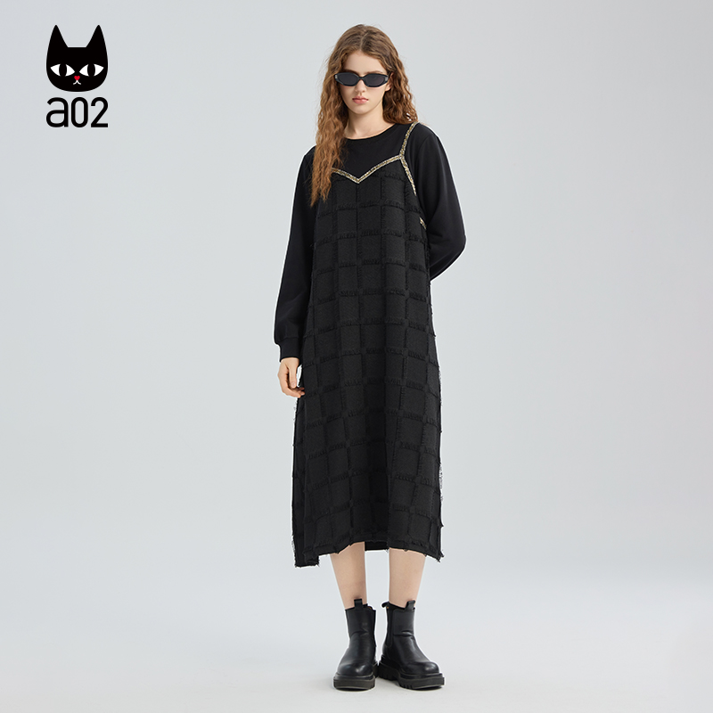 a02假两件拼接连衣裙女2025秋季 黑色吊带长裙设计感通勤穿搭 新款