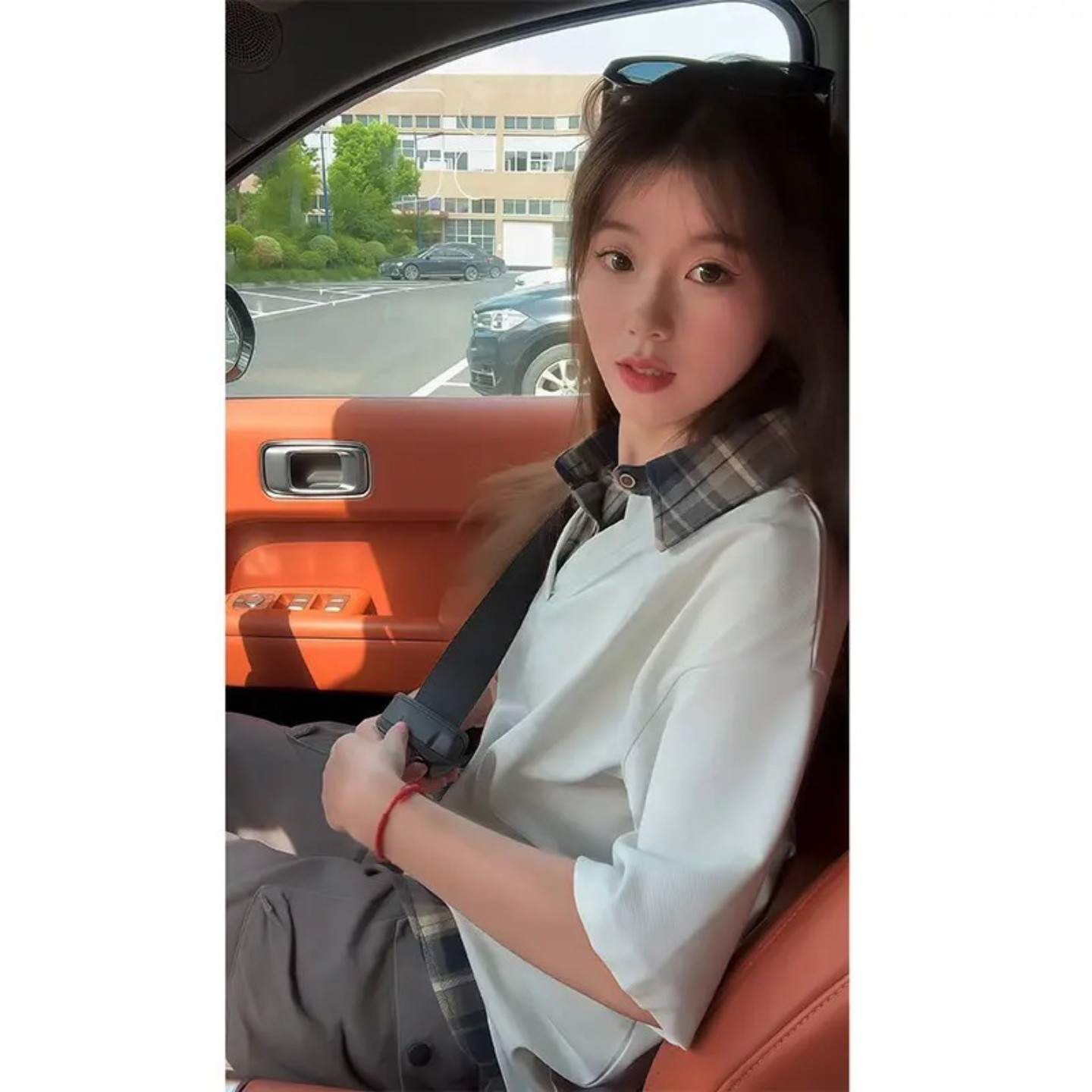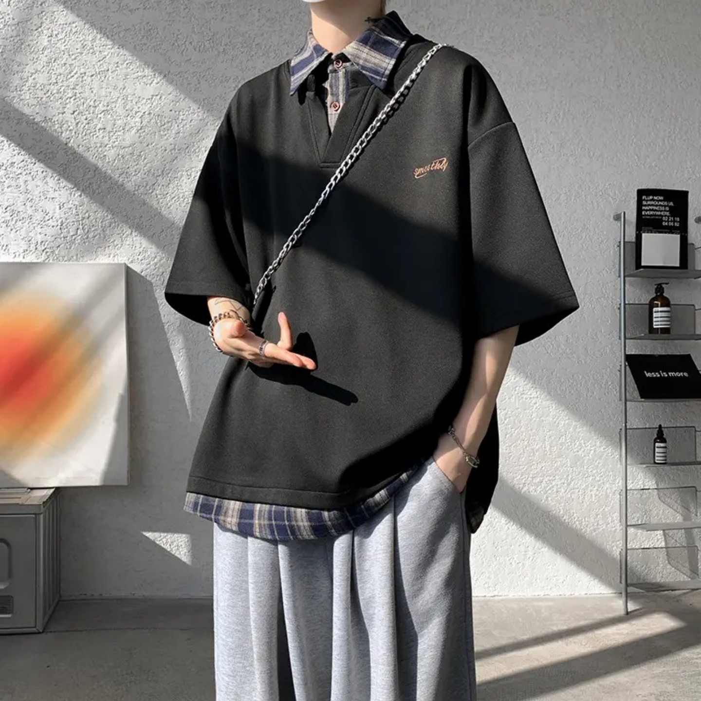 复古v领半截袖 假两件格子衬衫 痞帅高级感翻领t恤美式 男款 领polo衫
