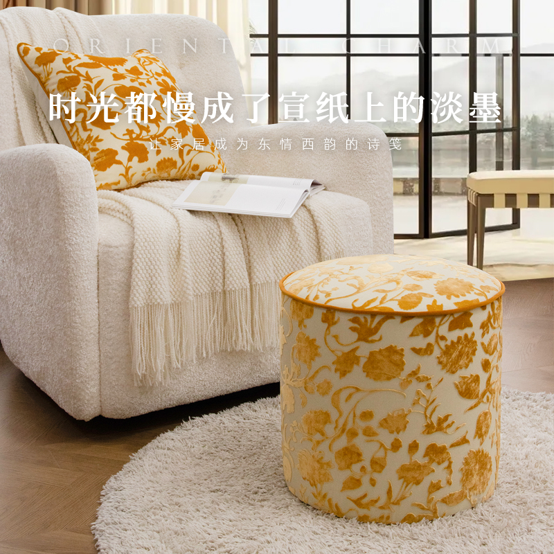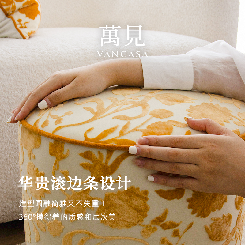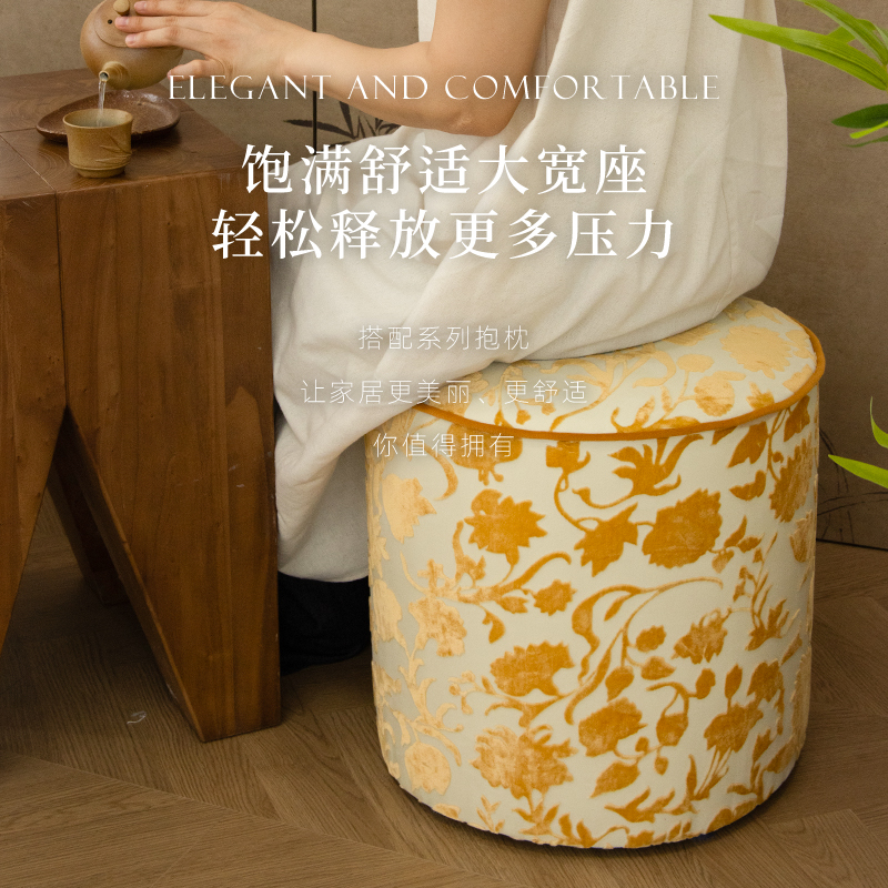凳 中国风坐墩客厅凳子矮凳实木软包圆凳换鞋 VANCASA藤黄叠翠 法式