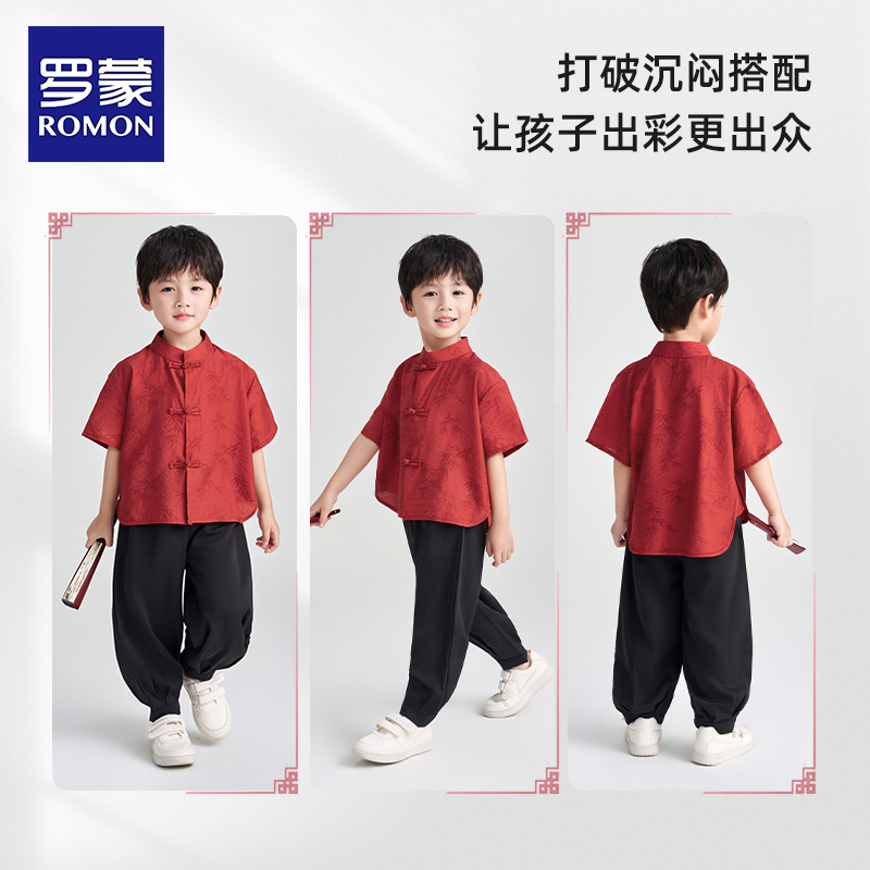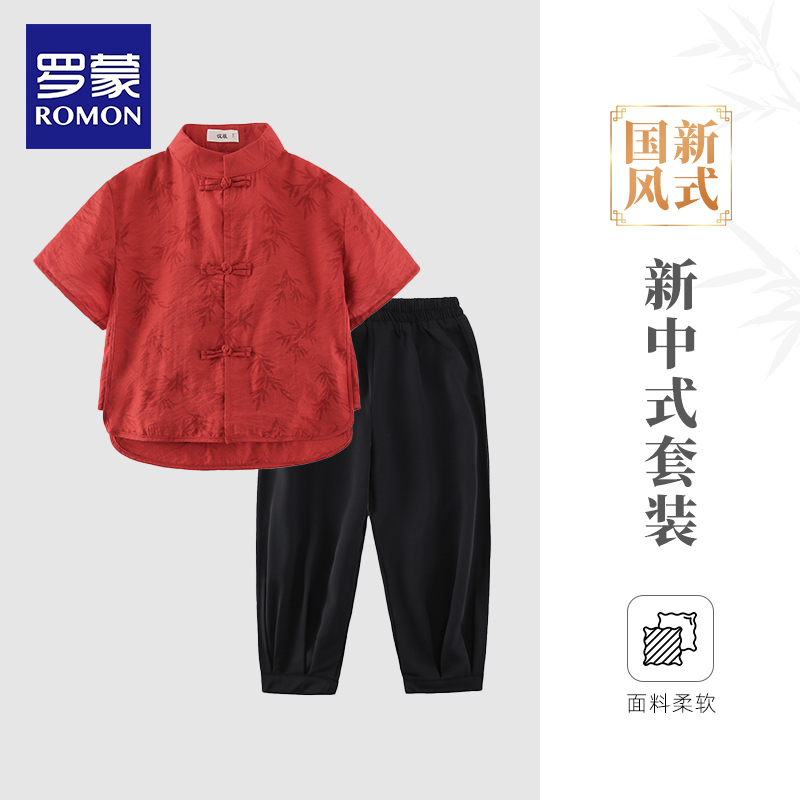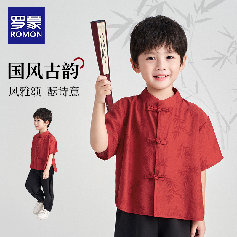 红色夏秋季 唐装 中国风中秋新中式 短袖 汉服新款 罗蒙男童演出服套装
