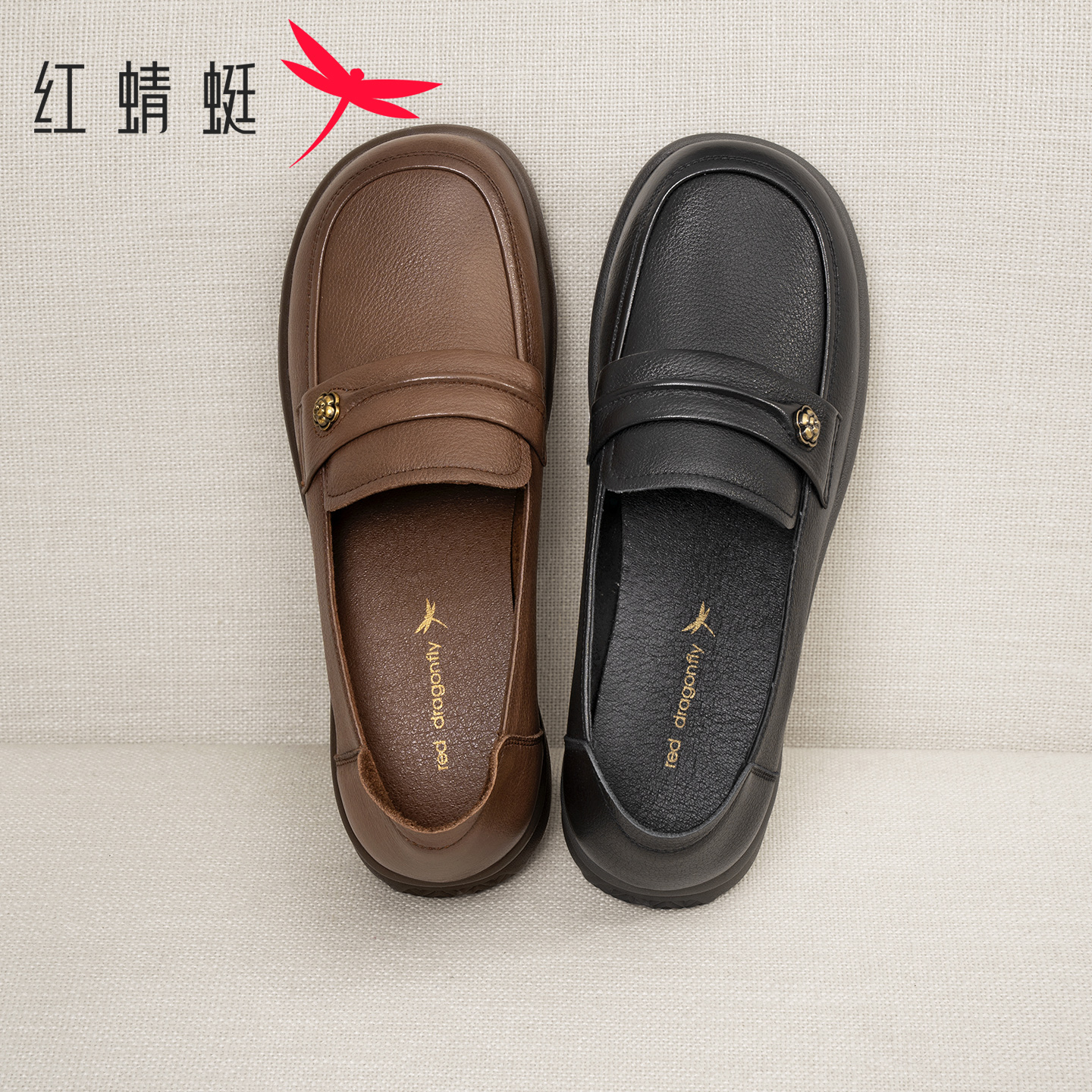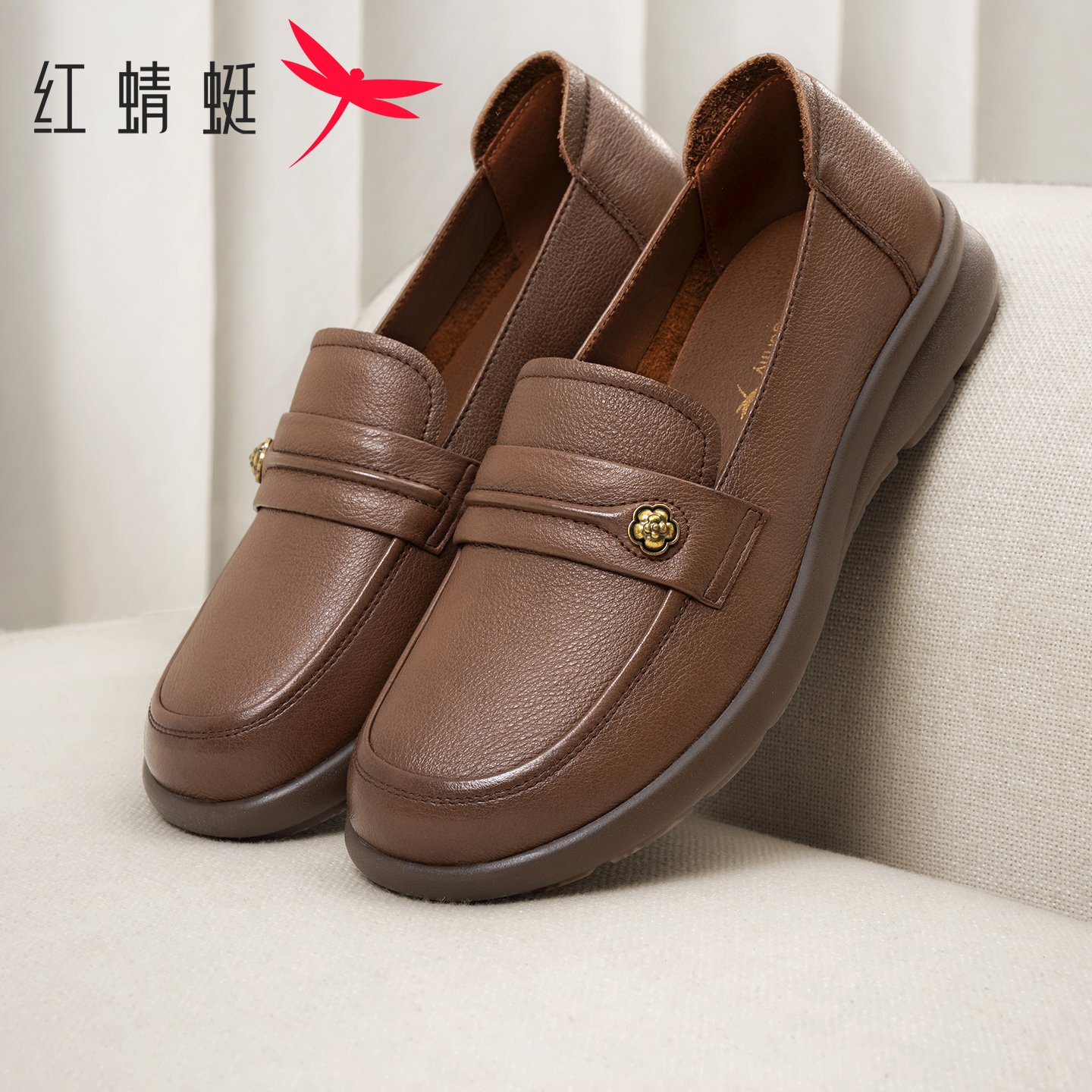 2025秋季 女士平底鞋 新款 一脚蹬皮鞋 真皮软底舒适妈妈鞋 红蜻蜓女鞋