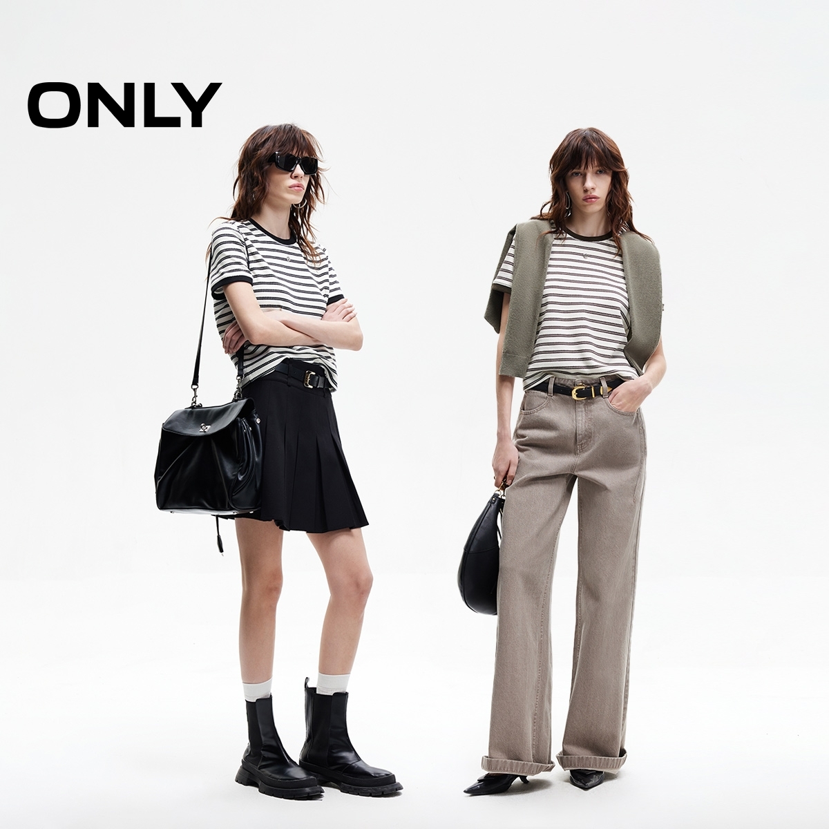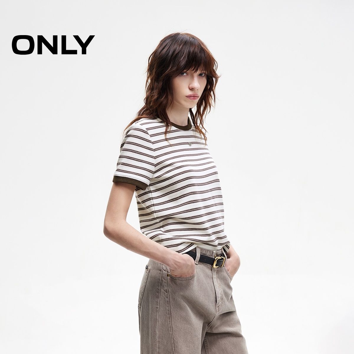 ONLY2025秋季 优雅显瘦条纹柔软舒适亲肤撞色拼接圆领T恤女 新款