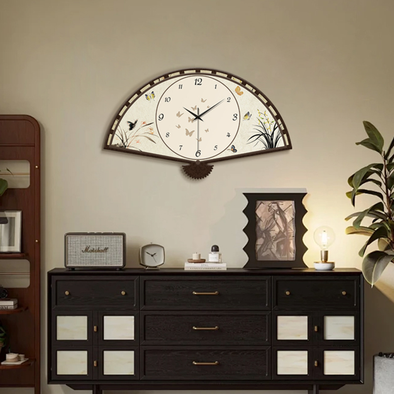 中古风折扇挂钟客厅2024新款 复古创意时钟挂墙画 餐厅钟表画新中式