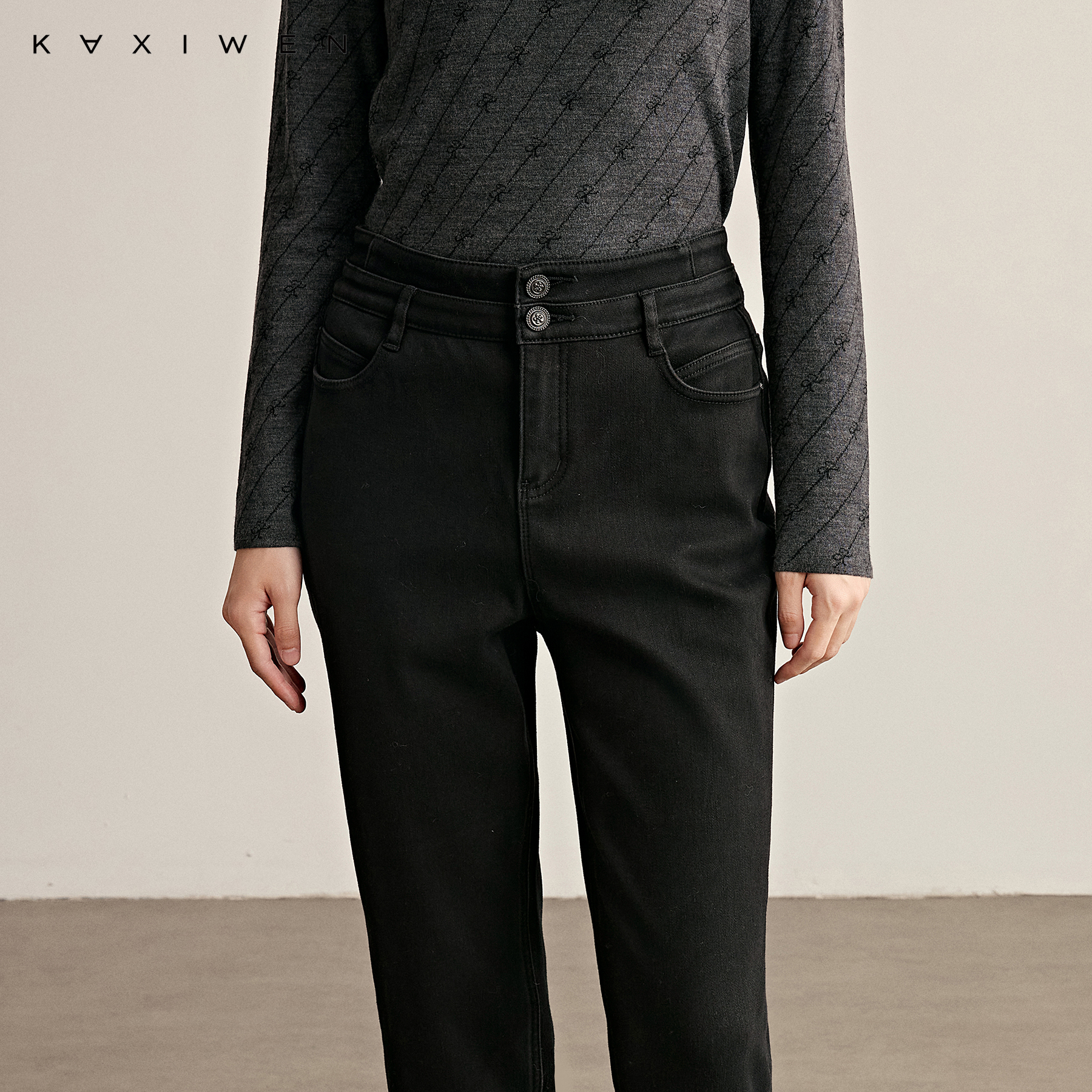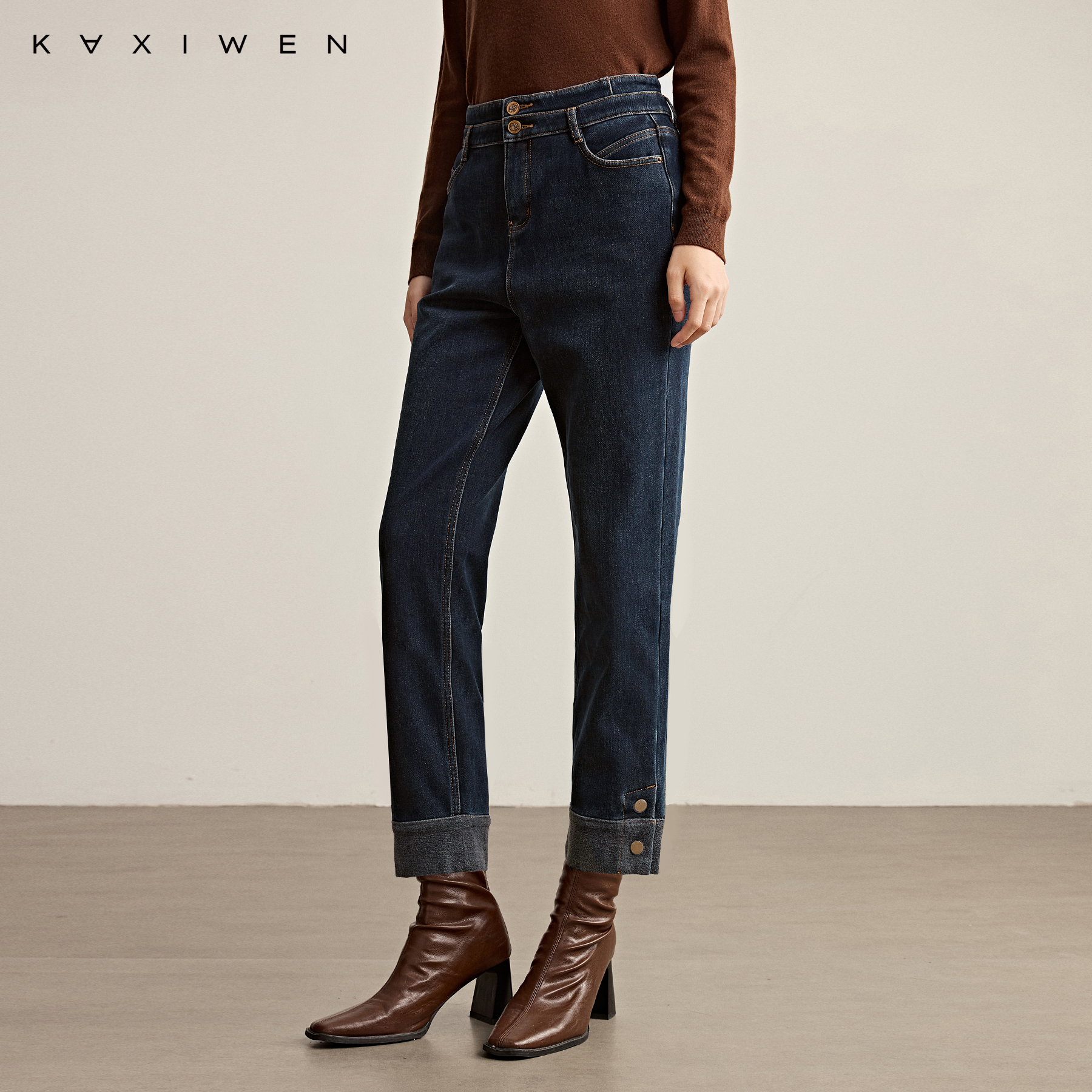 通勤高腰双扣翻边裤 时尚 腿 2025秋冬新款 佧茜文复古水洗牛仔裤