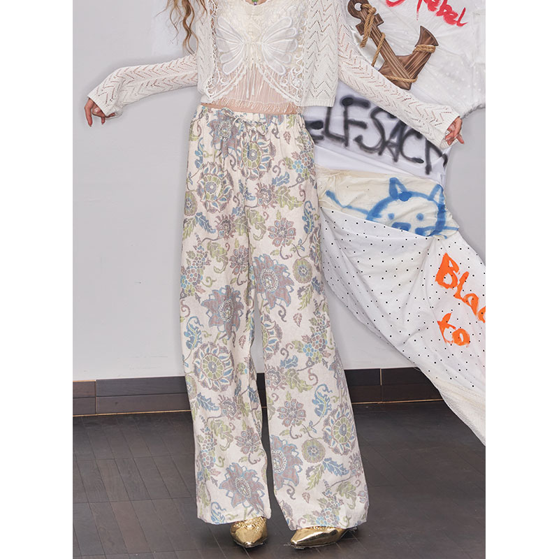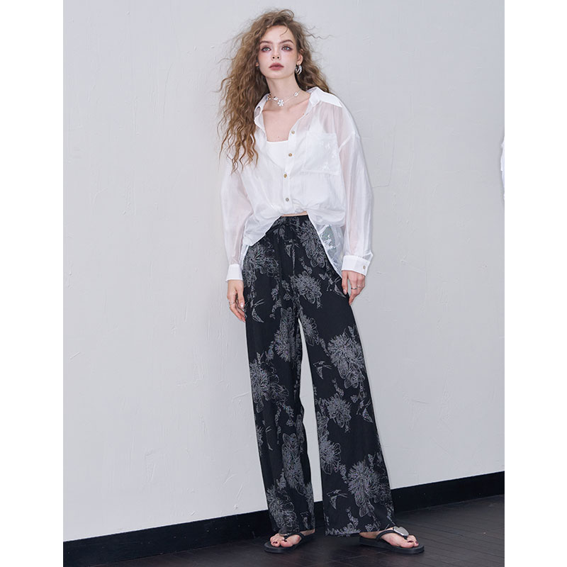 高级感宽松直筒休闲裤 妖精 女2025早秋新款 印花阔腿裤 子 口袋法式