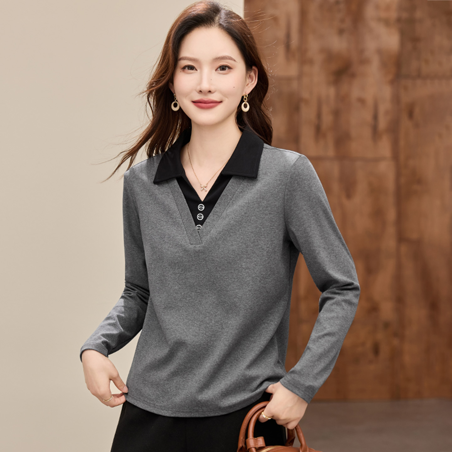 翻领长袖 假两件上衣洋气打底衫 t恤女2025新款 女装 早秋爆款 polo衫