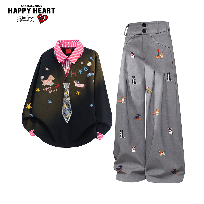 查尔斯桃心假两件学院风领带卫衣休闲小狗套装 男情侣宽松直筒长裤