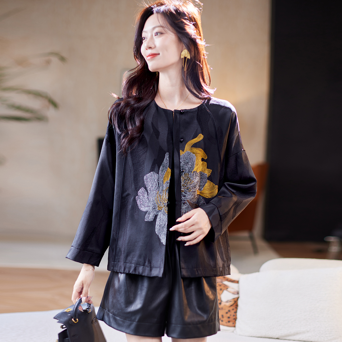 女装 宝诗黎圆领亮丝刺绣提花短外套2025秋季 气质百搭休闲宽松大码