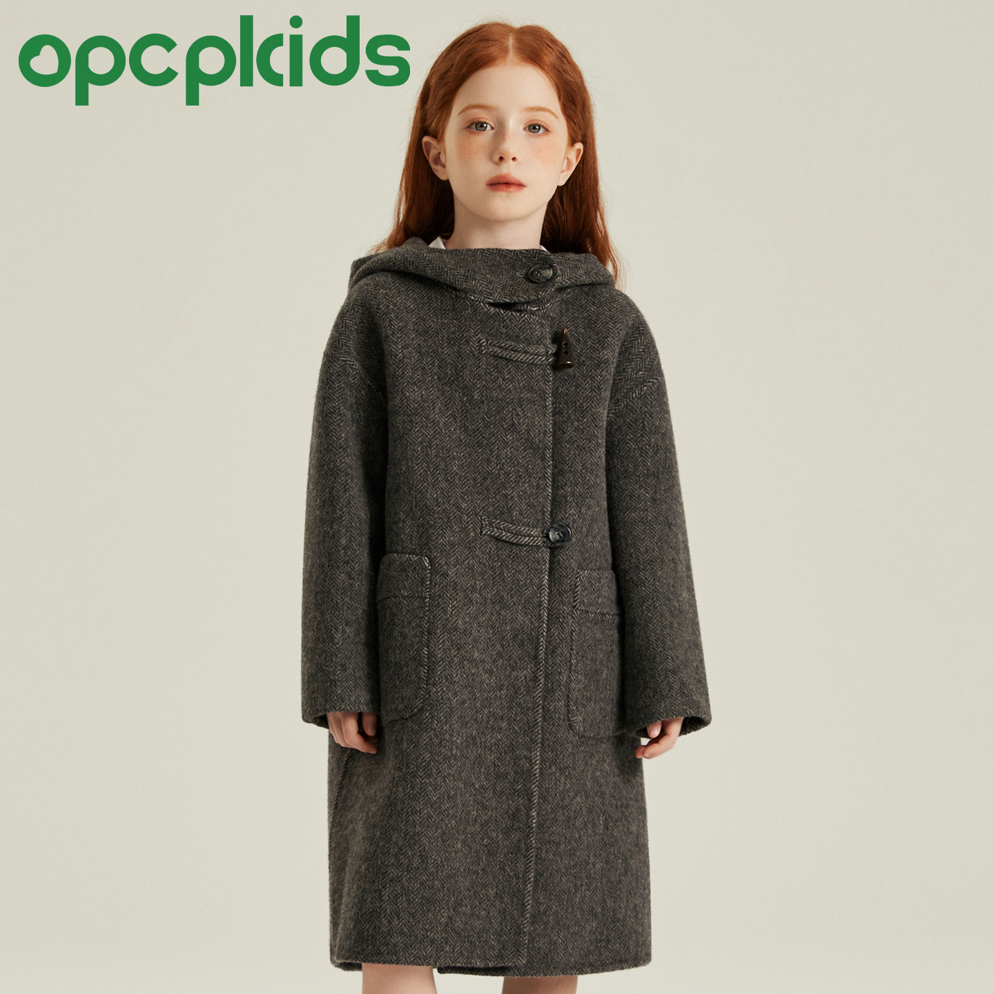 新款 宽松羊毛外套毛呢呢子女 连帽大衣 灰色牛角扣长款 Fabrique