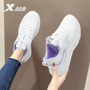 防水百搭运动鞋 特步皮面女鞋 子轻便软底跑鞋 黑色休闲鞋 女 2025秋季