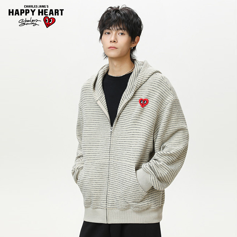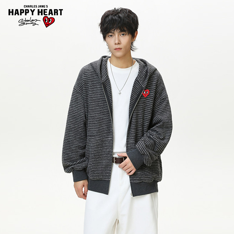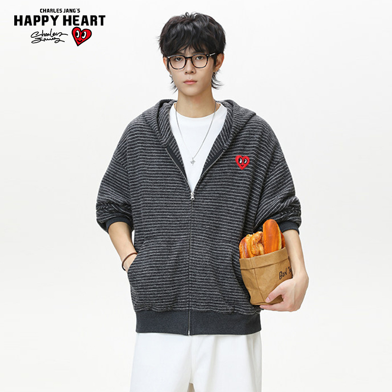 卫衣男秋季 复古条纹开衫 懒惰风宽松情侣连帽外套 美式 查尔斯桃心