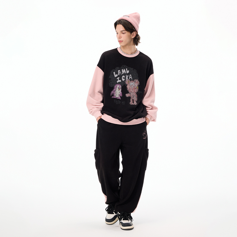 慵懒拼接束脚裤 运动宽松美式 女 男秋季 LAMLICKA黑色羊羔绒休闲卫裤