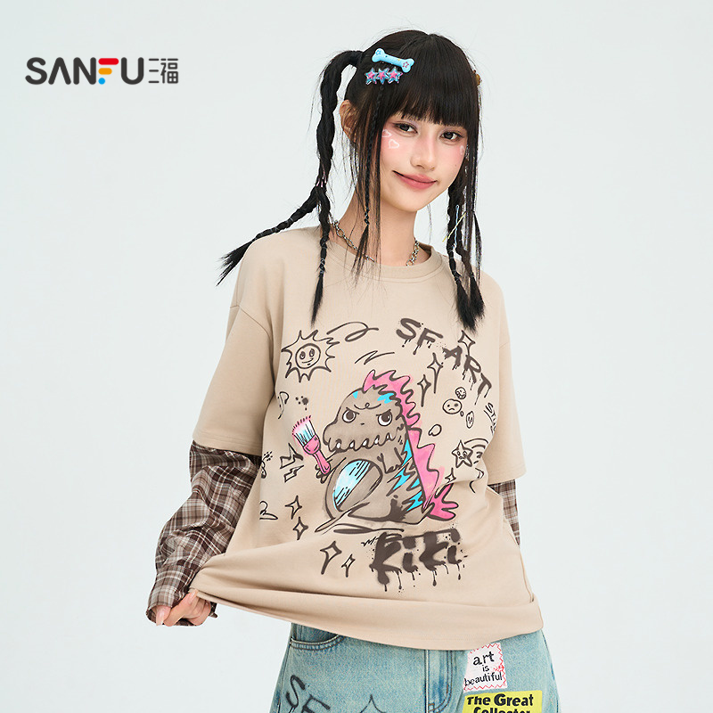 508129 恐龙印花格子拼接假两件上衣女装 三福无帽卫衣2025新款 秋季