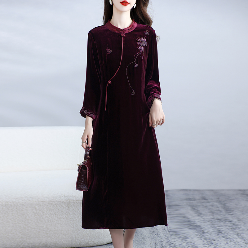 国风婚宴真丝丝绒连衣裙女喜婆婆桑蚕丝裙子新中式 刺绣春秋 妈妈装