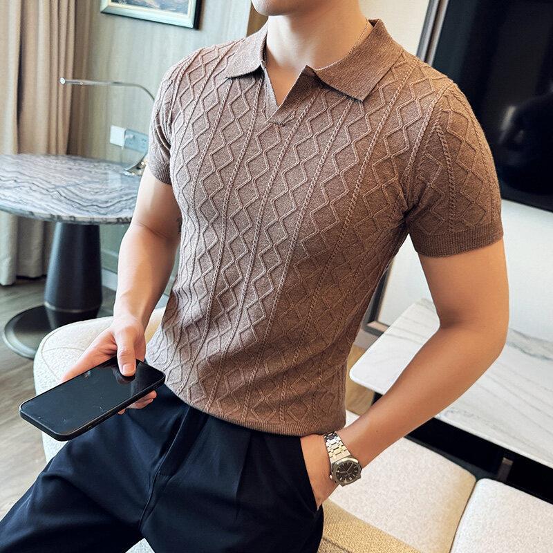 翻领T恤高级感打底衫 男潮流休闲半袖 菱形格V领针织Polo衫 速发正品