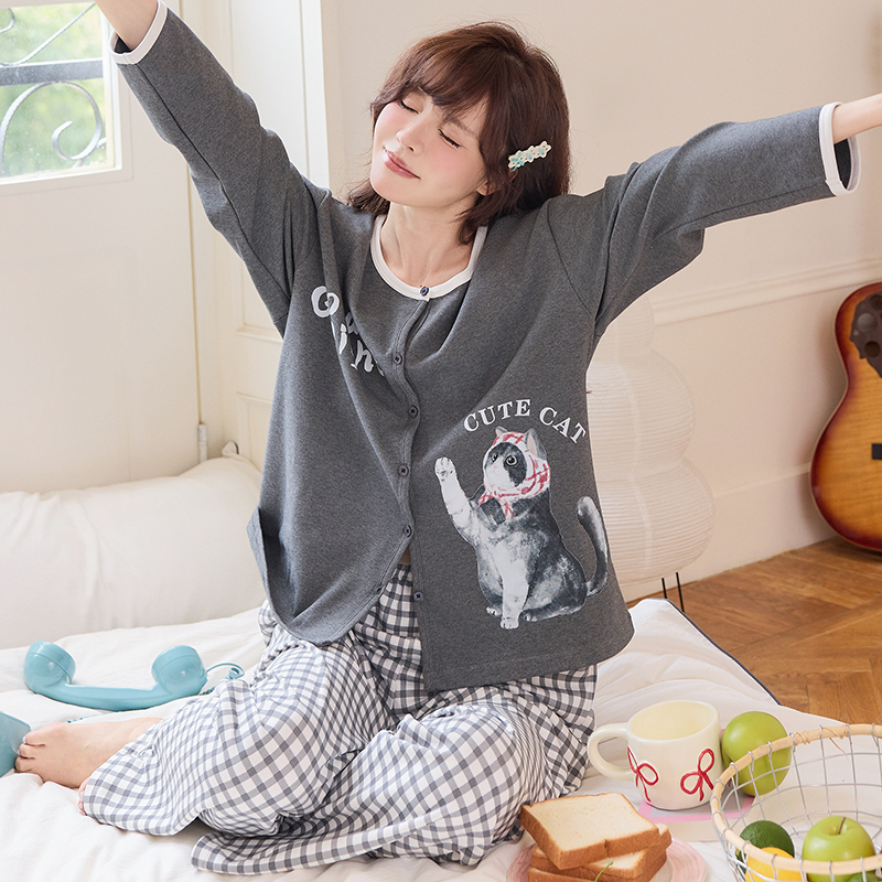 全棉家居服套装 芬腾情侣睡衣女春秋款 圆领套头男大码 男士 纯棉长袖