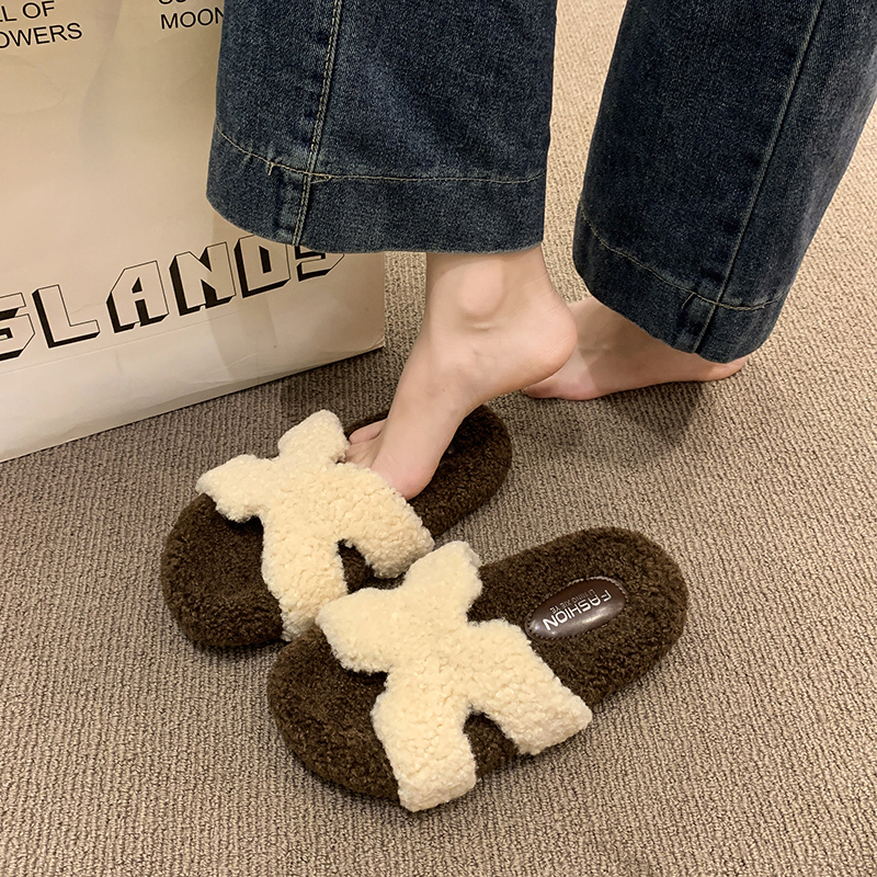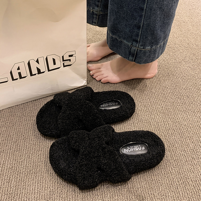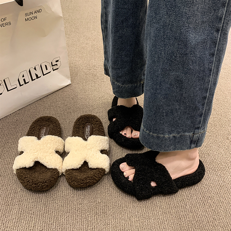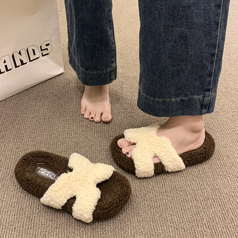 羊羔毛棉拖鞋 2025新款 女外穿加绒保暖一字秋冬季 平底勃肯毛毛拖鞋