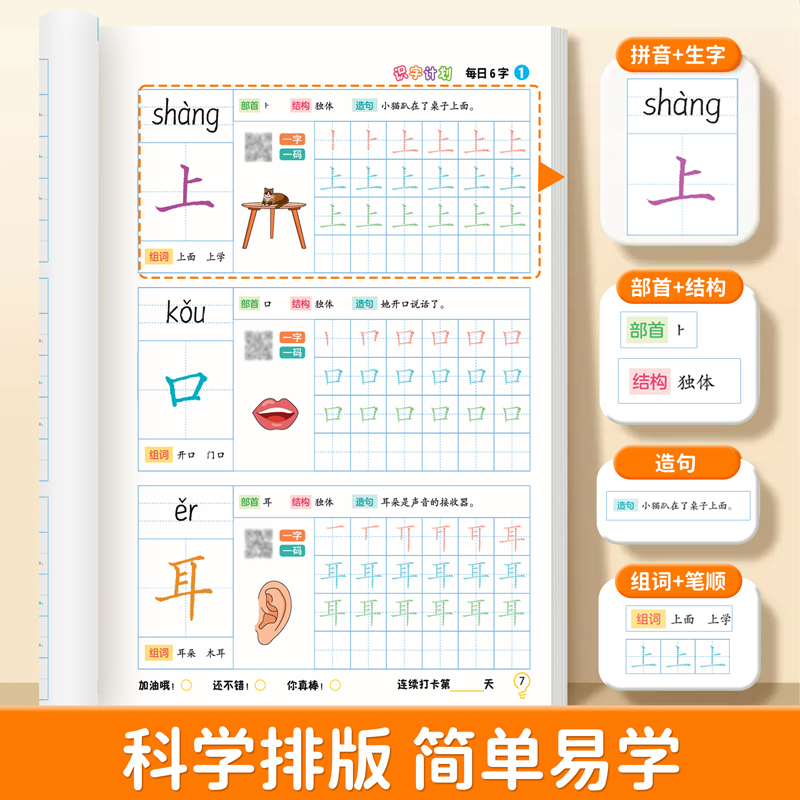 每日6字练字贴幼儿园控笔训练幼小衔接点阵汉字描红本一年级写字本学前班儿童字帖每日一练初学者练字练习幼升小写字入门大班专用