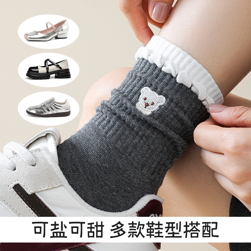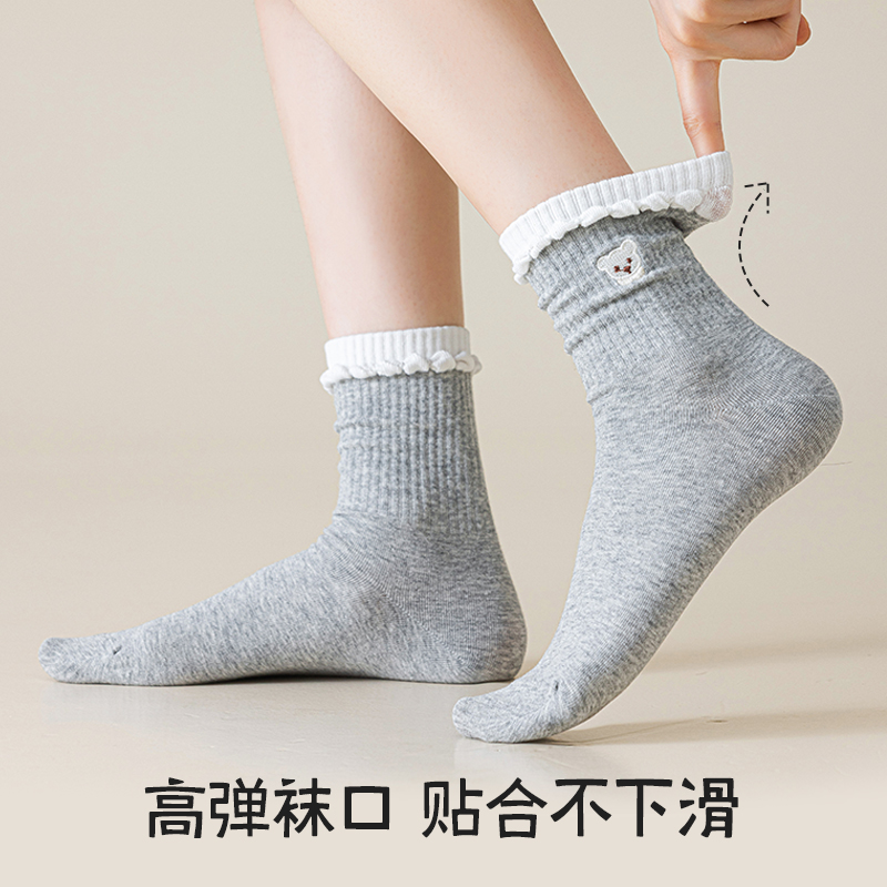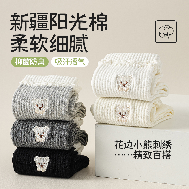 爆款 中筒袜2025新款 可爱女袜长筒棉袜 春秋款 小熊刺绣白色袜子女款