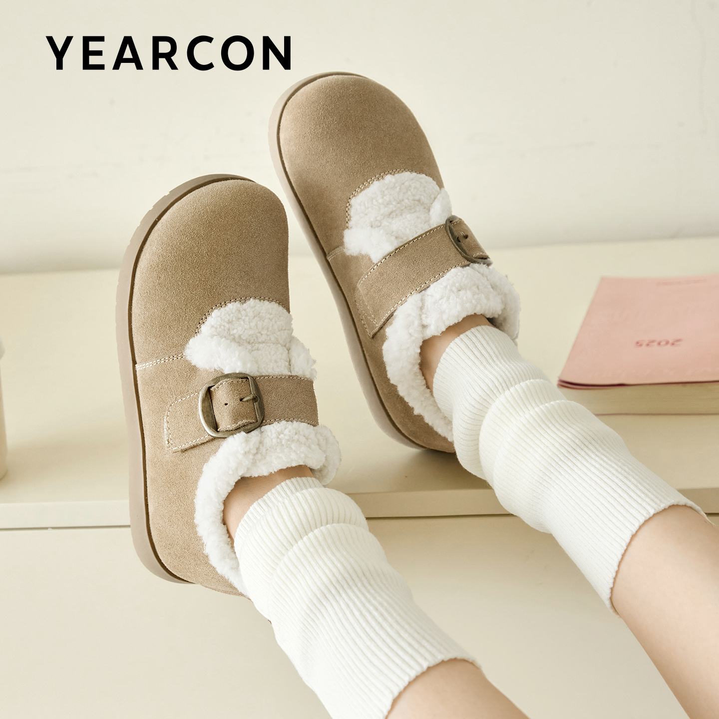 一脚蹬休闲棉鞋 加厚毛毛鞋 女冬外穿2025新款 意尔康真皮加绒勃肯鞋