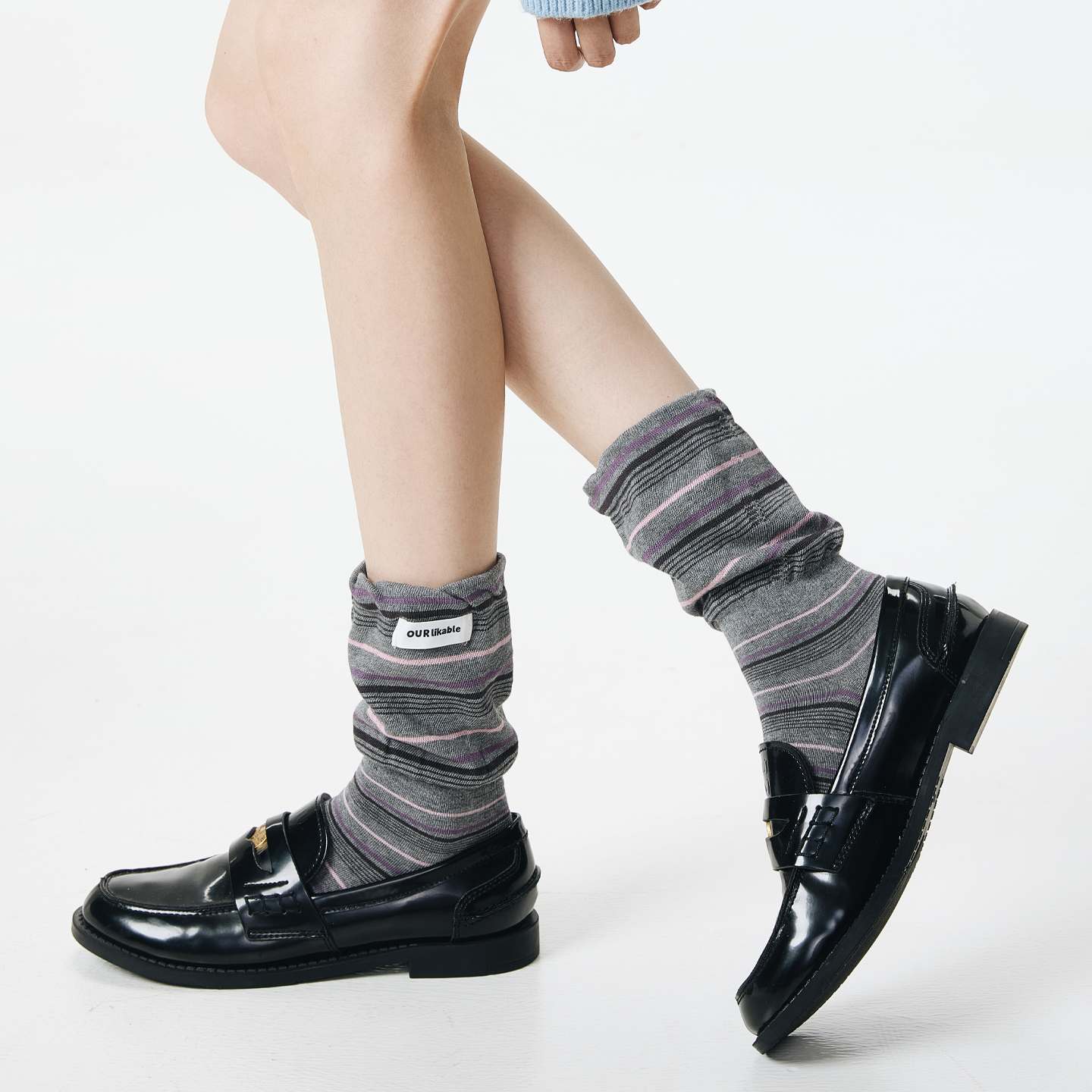 松口显瘦长筒堆堆袜 春秋款 咖色复古条纹袜子女士中筒2025新款 爆款