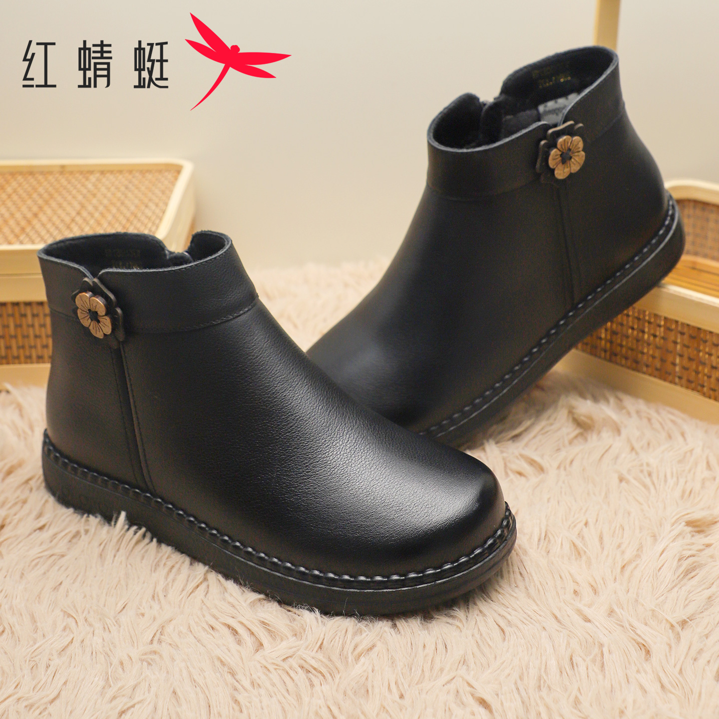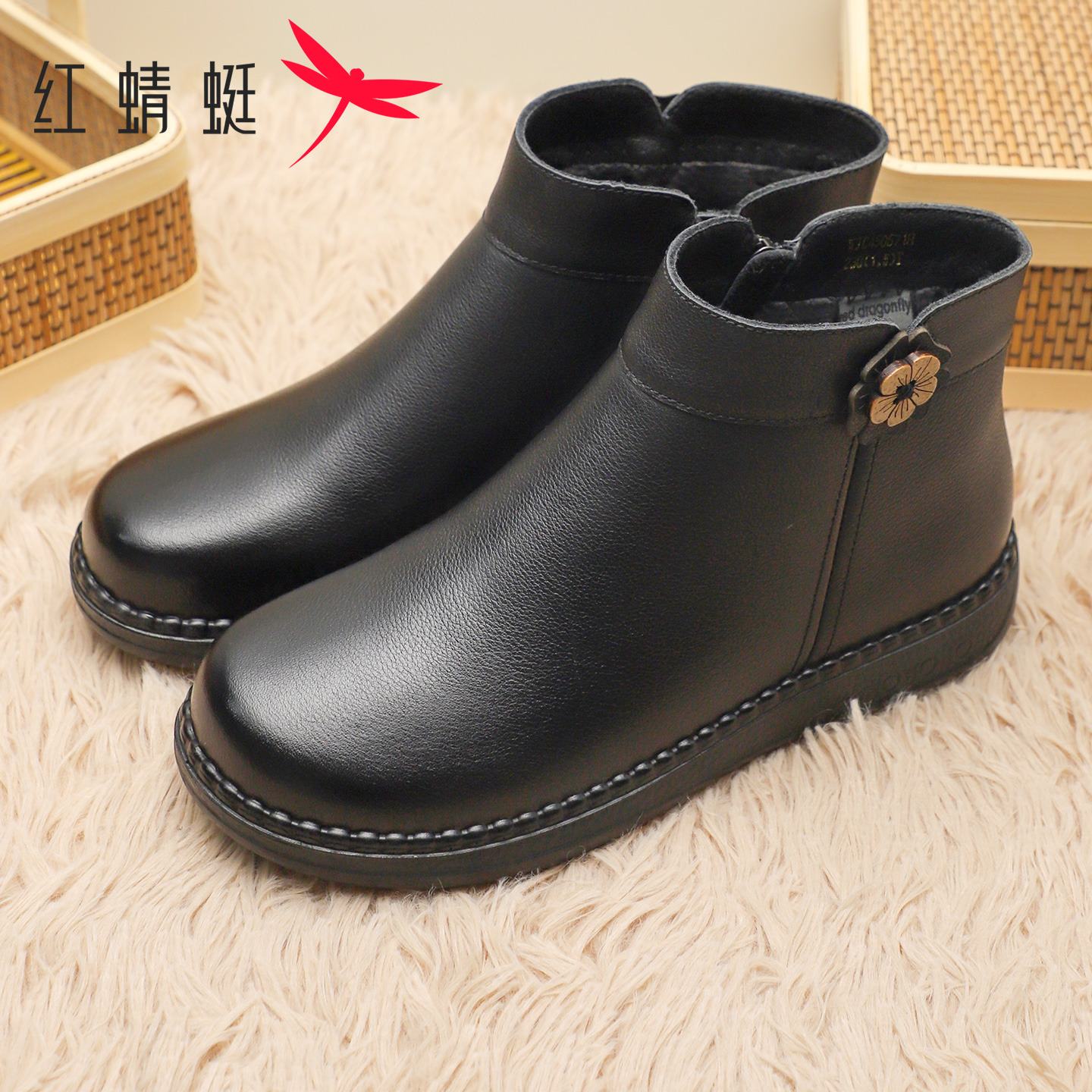 休闲短靴舒适加绒保暖妈妈棉鞋 时尚 真皮英伦马丁靴 冬季 红蜻蜓女鞋