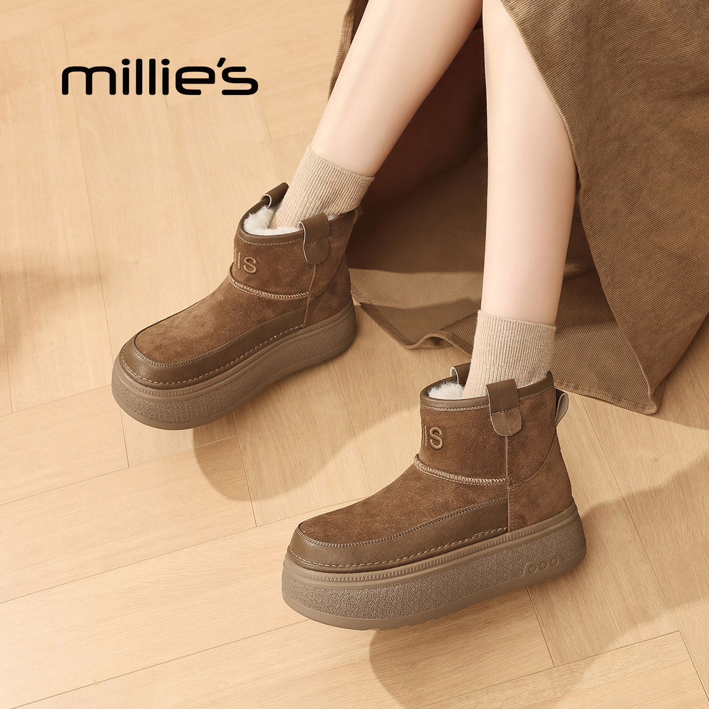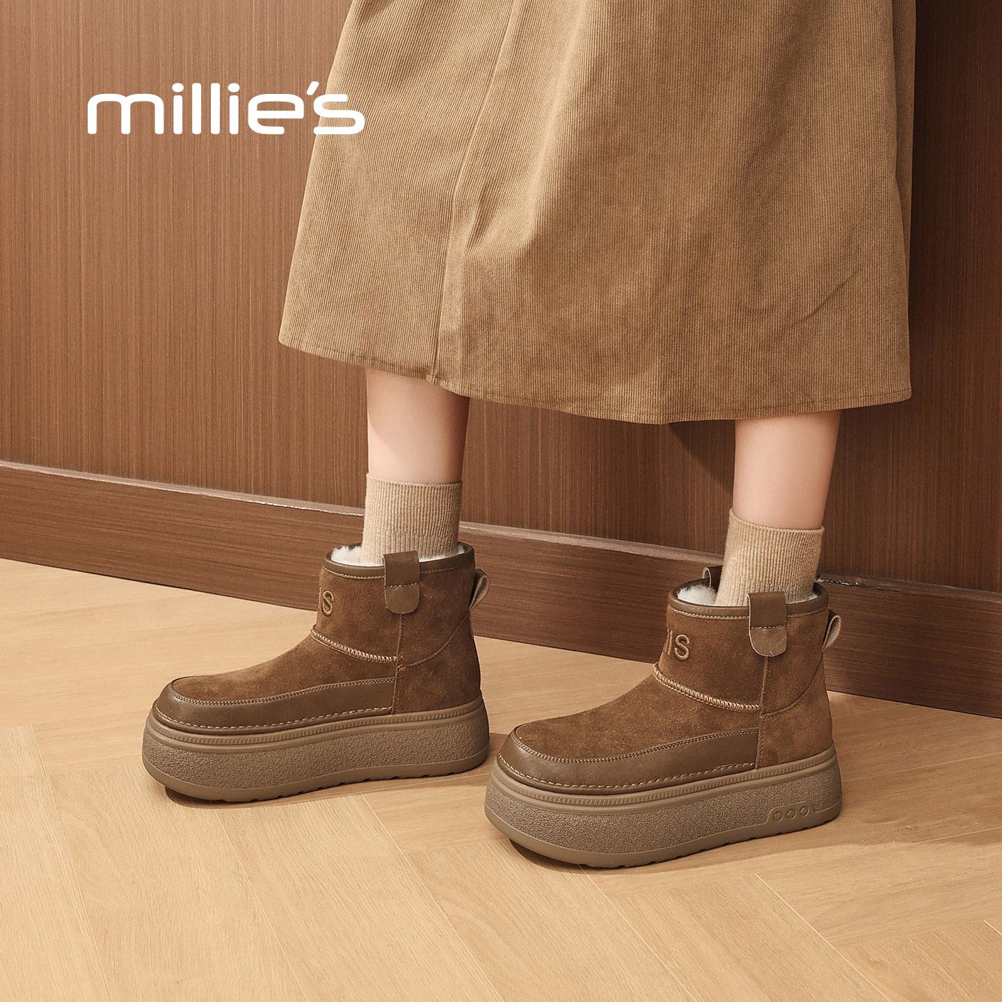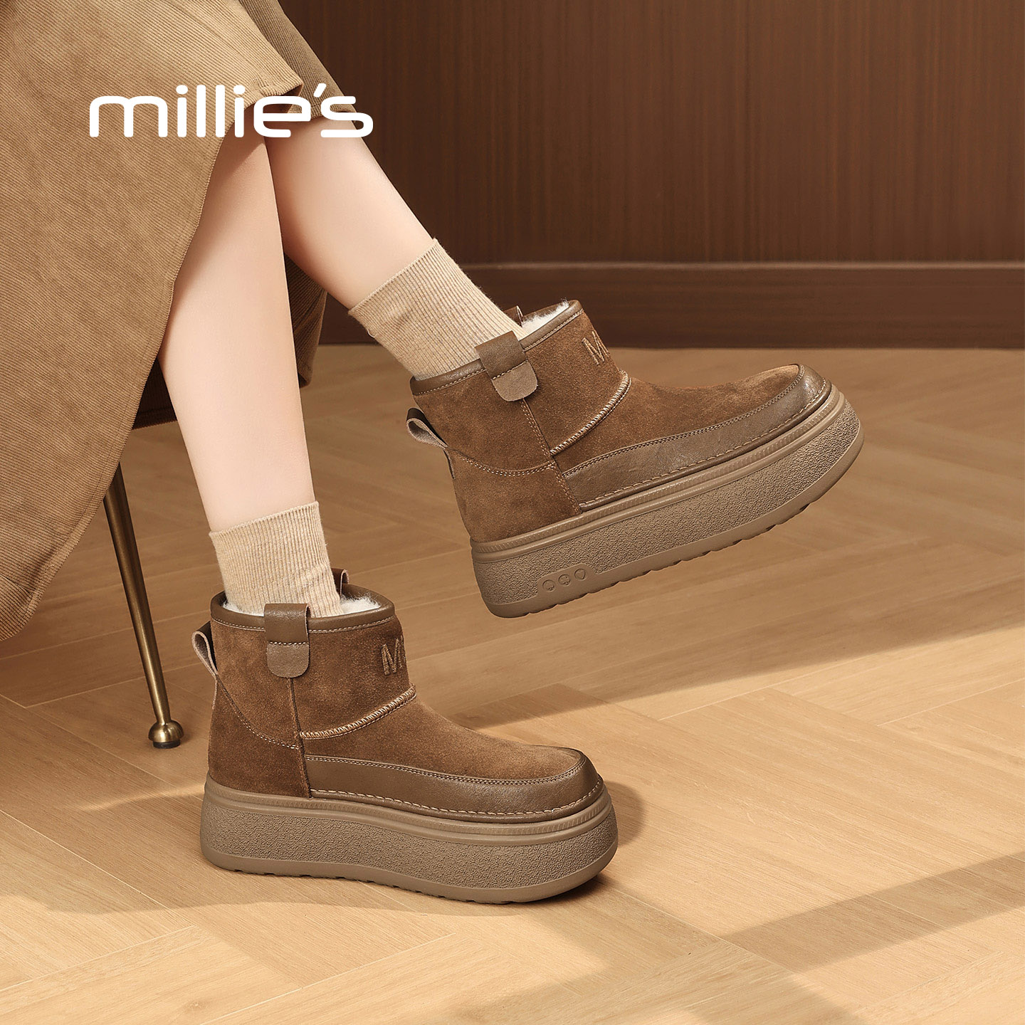 百丽加绒保暖棉鞋 真皮厚底切尔西短靴E5D1DDD5预 休闲靴子女25冬款