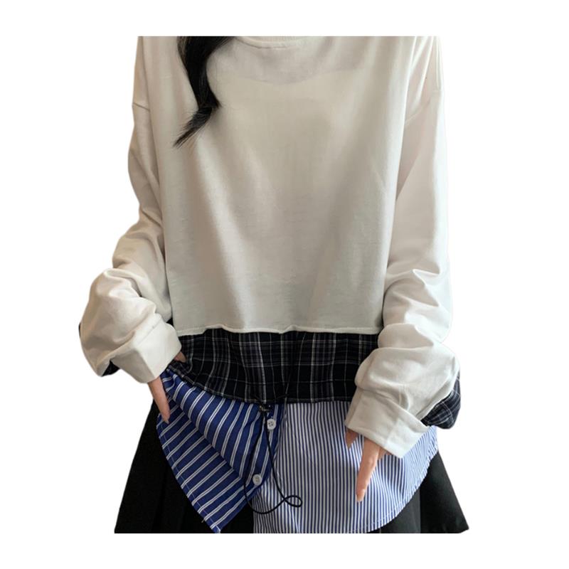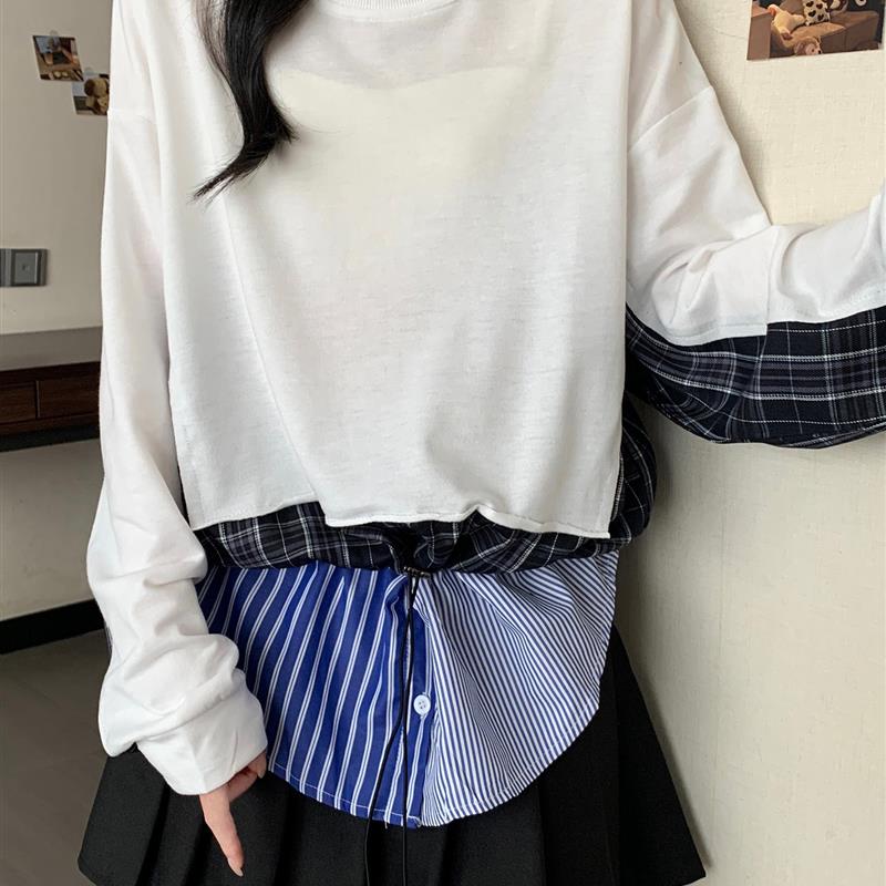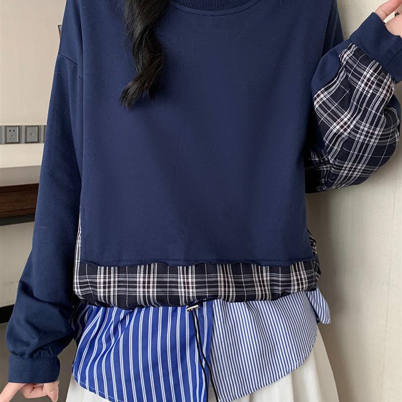 胖mm宽松超火减龄打底衫 新品 大码 卫衣女春秋季 格子拼接假两件长袖
