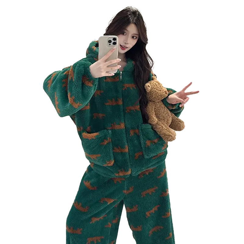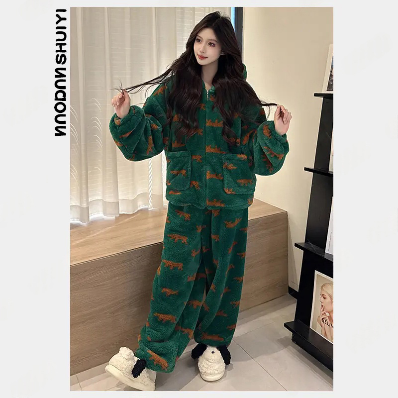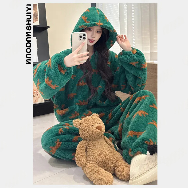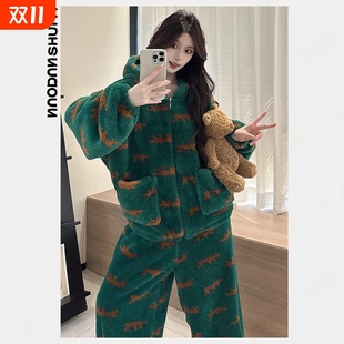 法兰绒女士连帽家居服套装 珊瑚绒加绒加厚2025新款 睡衣女款 秋冬季