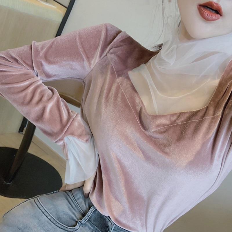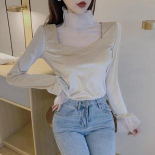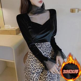 高领网纱上衣内搭长袖 蕾丝小衫 T恤1012z 女法式 秋冬金丝绒打底衫