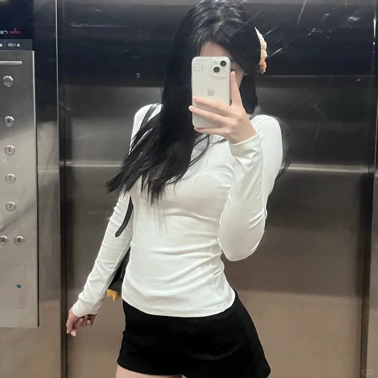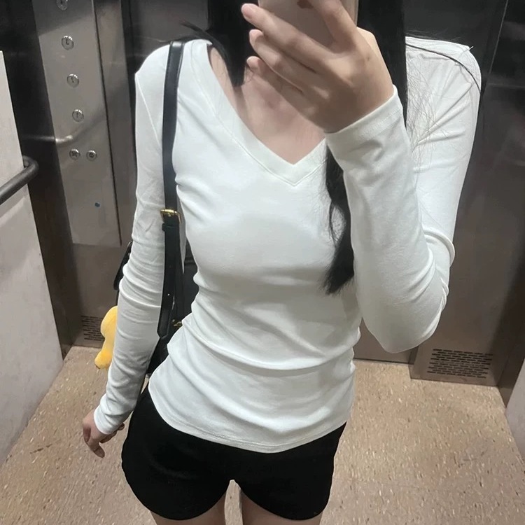 修身 白色辣妹纯欲v领正肩长袖 内搭打底衫 薄款 显瘦上衣 T恤女早秋季