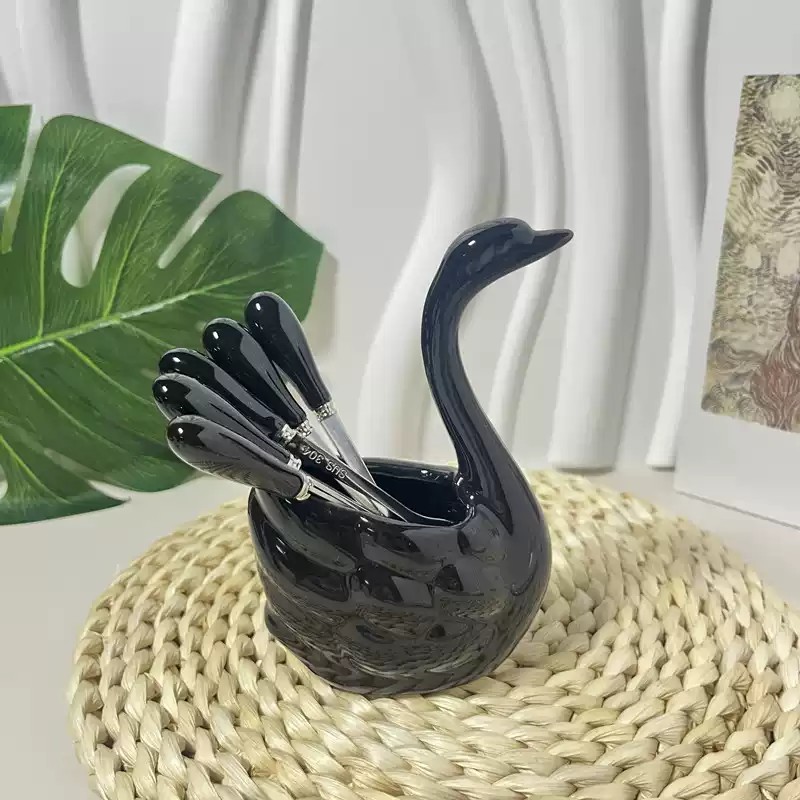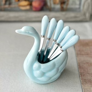 304不锈钢天鹅水果叉套装 陶瓷家用安全水果签收纳罐轻奢高级感