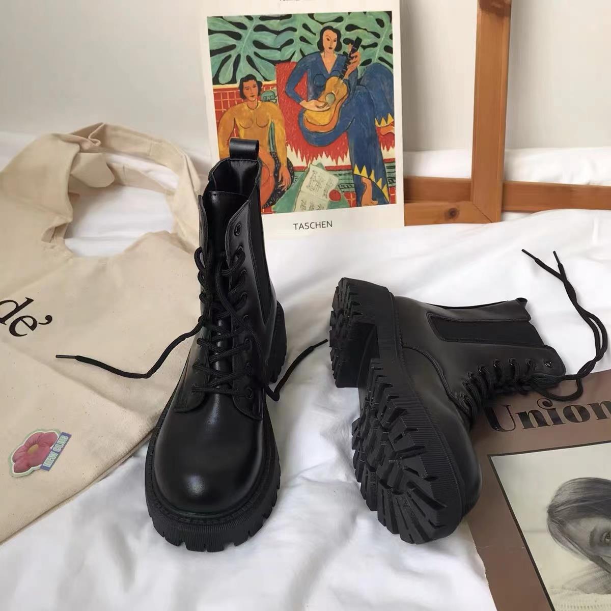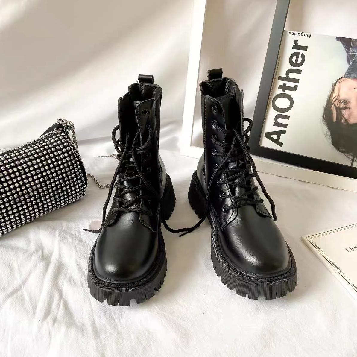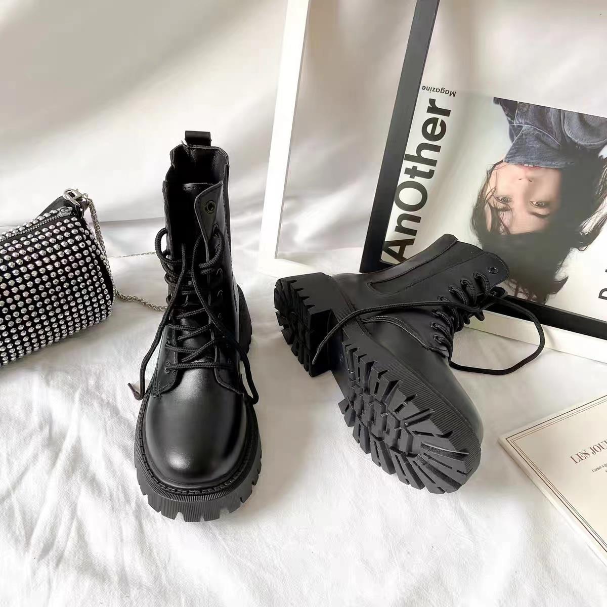 紅蜻蜓女鞋 英伦风厚底短靴黑色秋冬 潮马丁靴女春秋单靴2025年新款