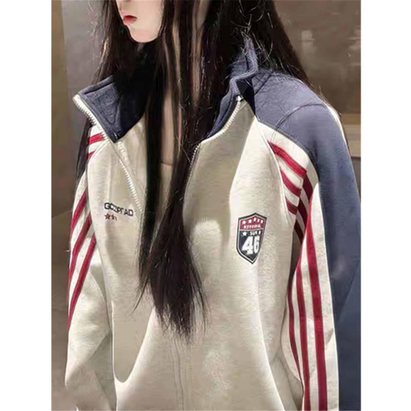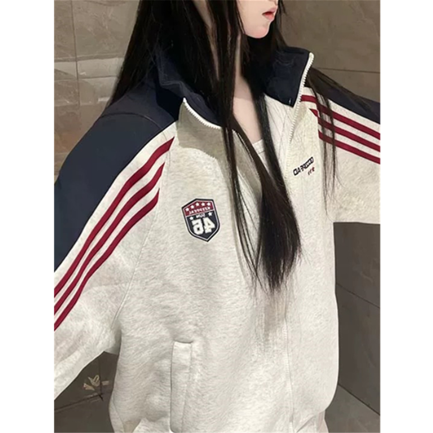 夹克上衣 立领卫衣外套女春秋宽松开衫 美式 复古撞色拼接条纹插肩袖