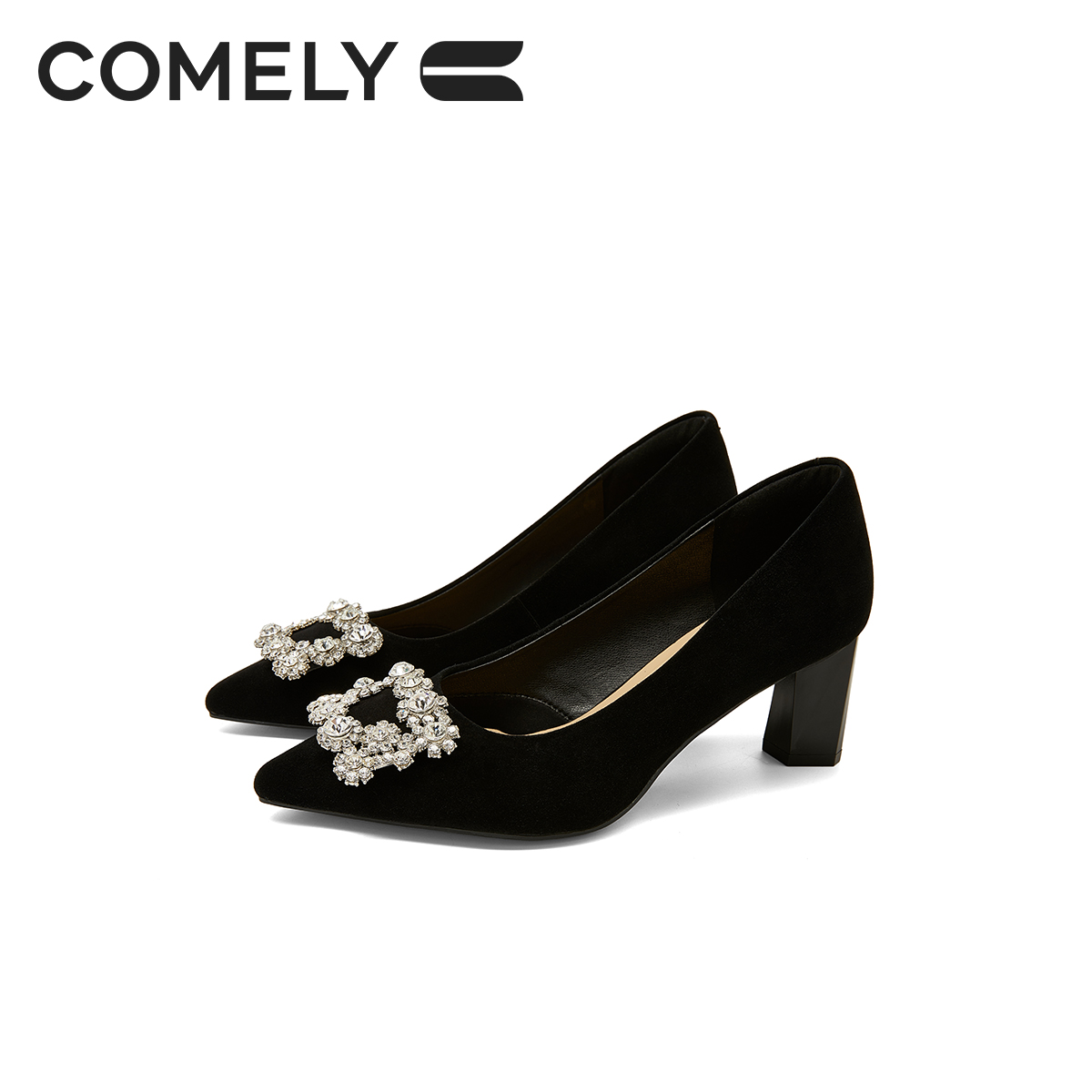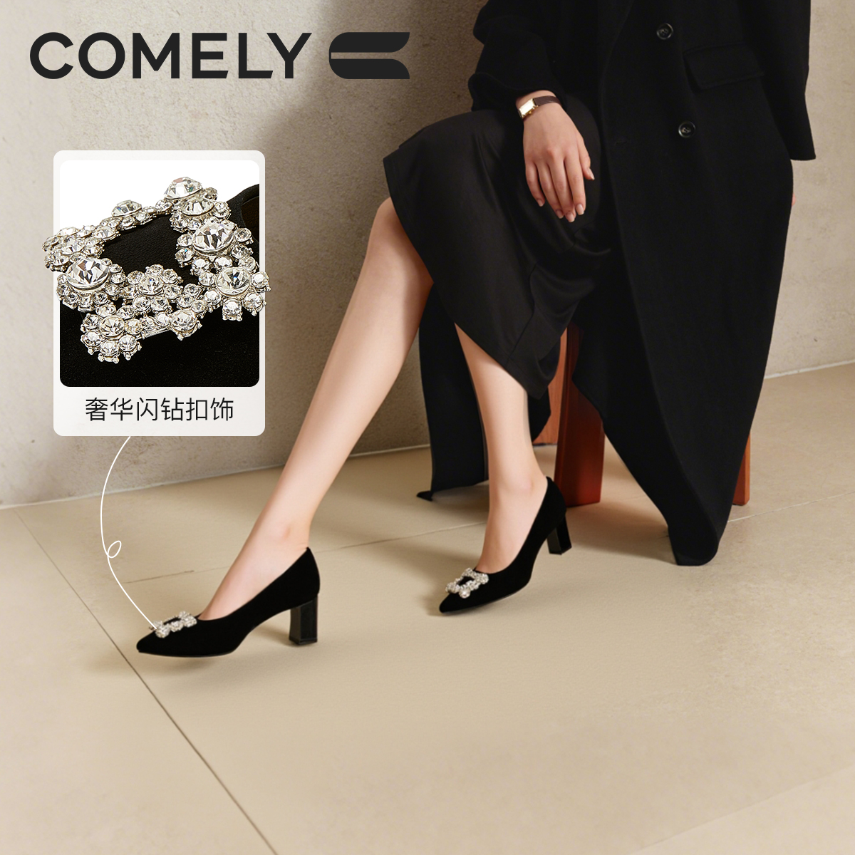 宴会鞋 粗跟百搭黑色单鞋 女2025年秋冬新款 康莉水钻尖头气质高跟鞋