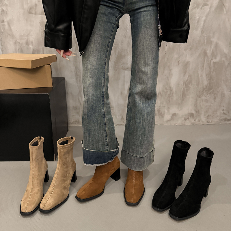 洋气质粗高跟瘦瘦靴女2025年新爆款 秋冬绒面弹力方头小个子裸靴子