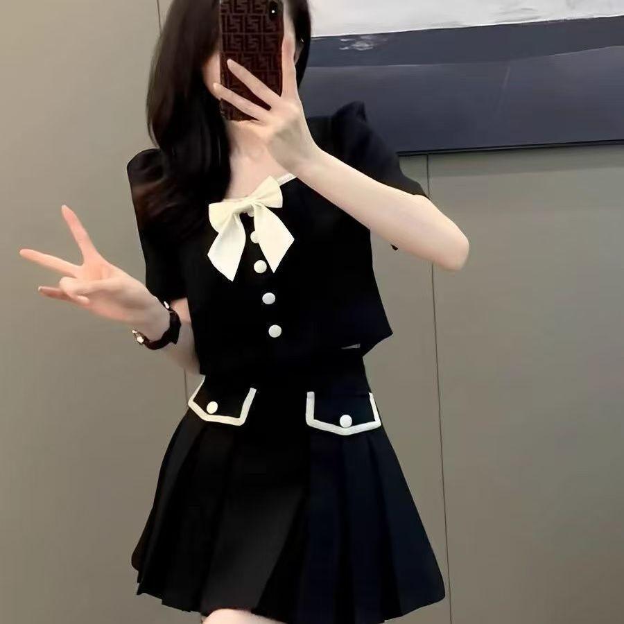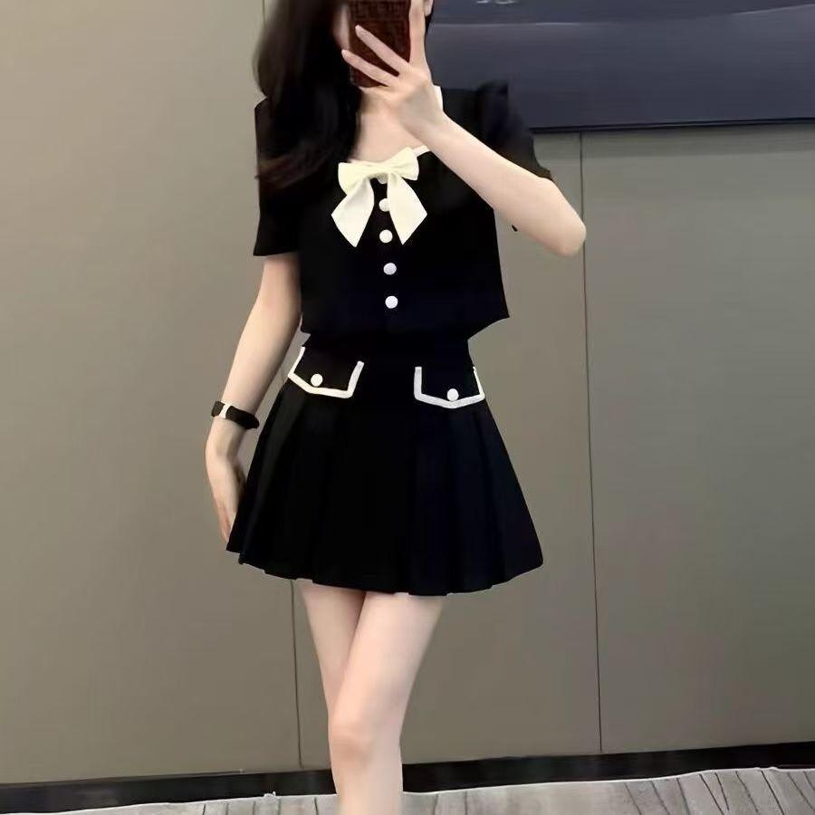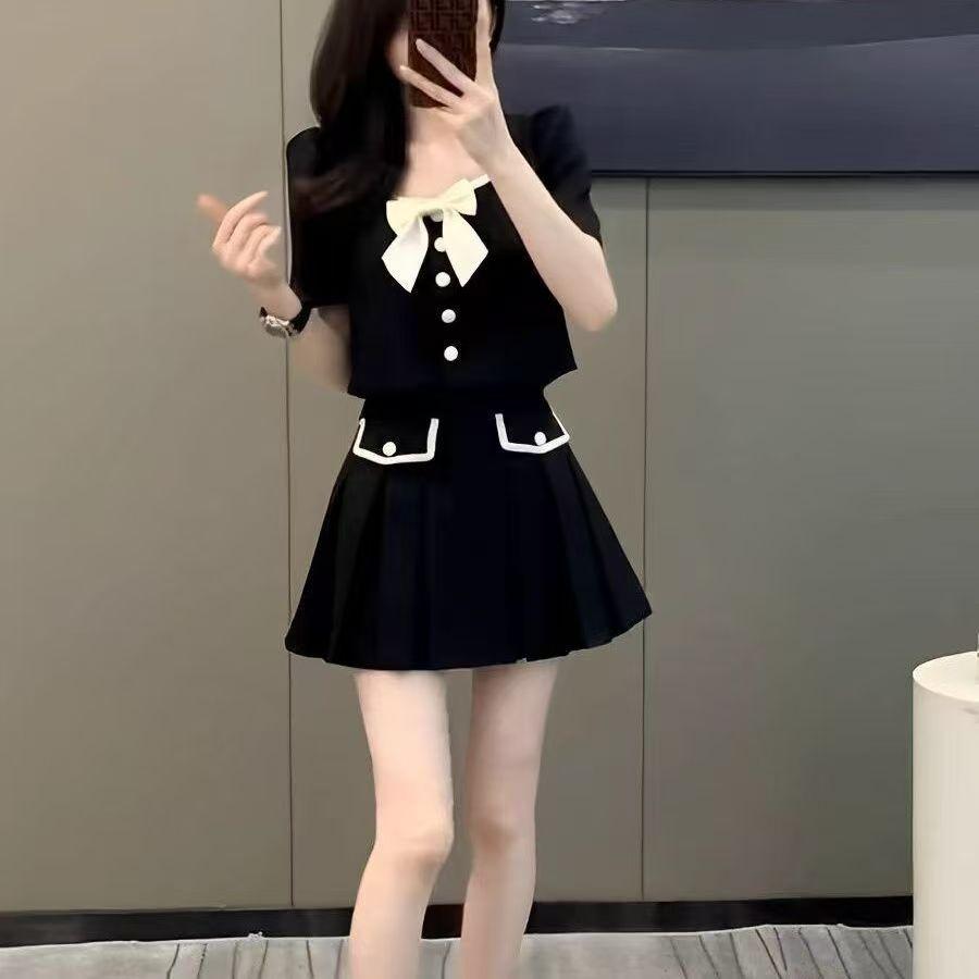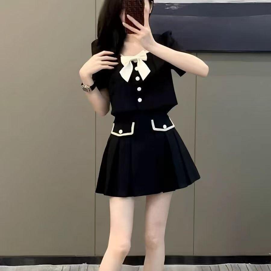 女新款 套装 高腰显瘦短裙两件套 气质黑色小香赫本风蝴蝶结短袖 法式