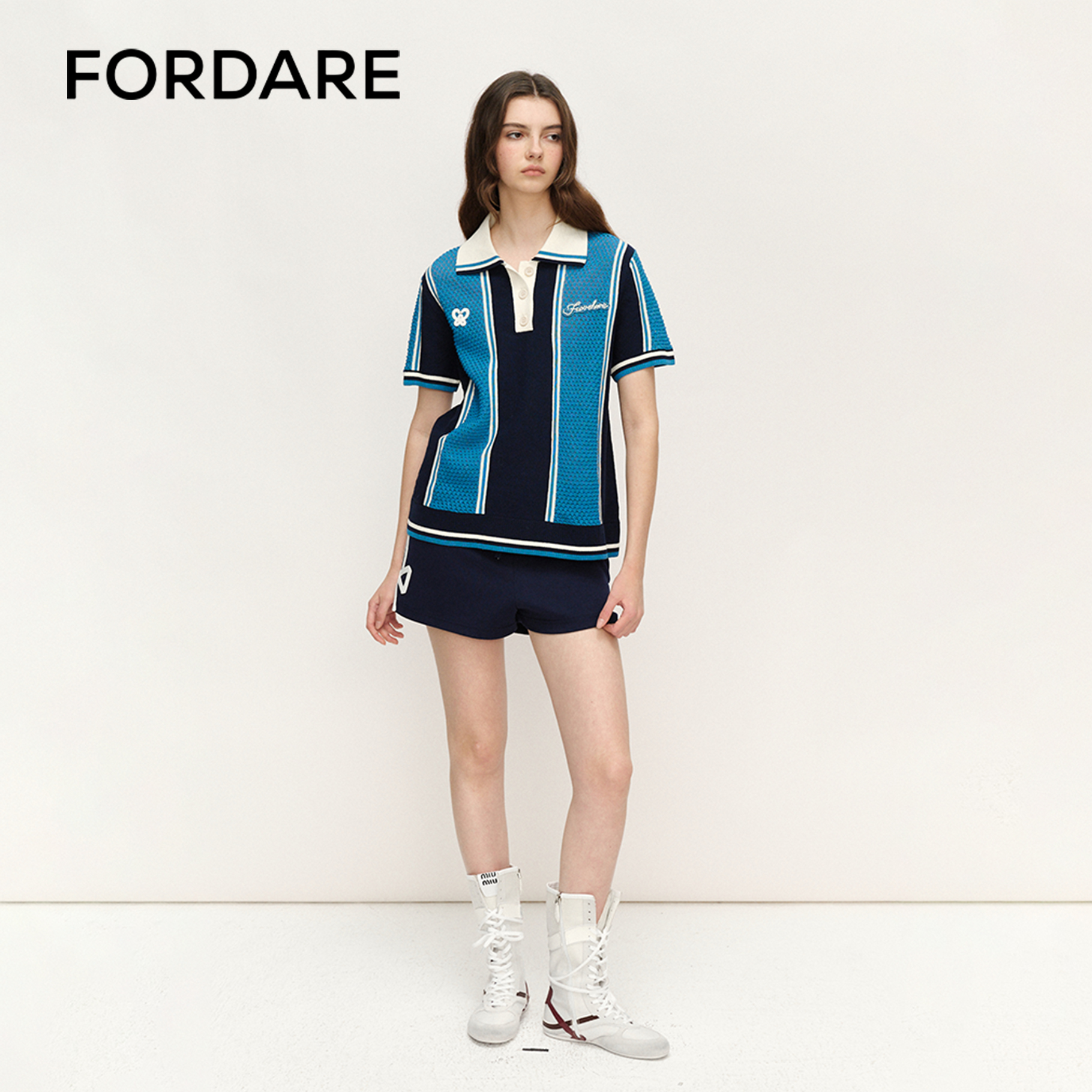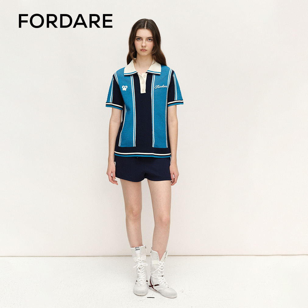 Polo领短袖 FORDARE 毛衫 蓝色条纹复古感经典 女上衣 福蝶25春夏女装