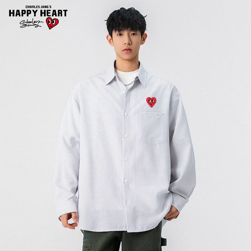 男女休闲爱心情侣外套 衬衫 查尔斯桃心春秋美式 学院风条纹翻领长袖